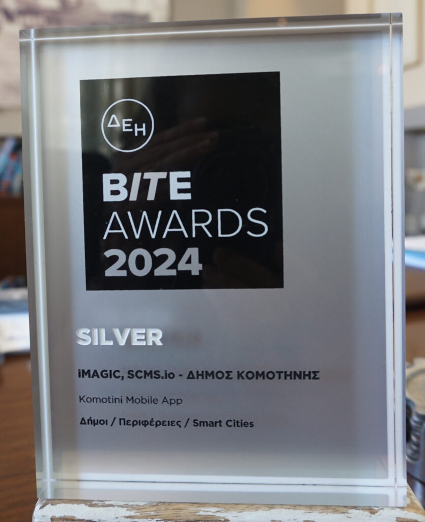Ο Δήμος Κομοτηνής κατέκτησε το ασημένιο βραβείο στα ΔΕΗ BITE Awards 2024, στην κατηγορία Δήμοι/Περιφέρειες/SmartCities, σε μια τελετή που πραγματοποιήθηκε στις 17 Σεπτεμβρίου στην Αθήνα. Αξιοποιώντας το πιο σύγχρονο και απαραίτητο μέσο της καθημερινότητάς μας, το κινητό τηλέφωνο, ο Δήμος Κομοτηνής δημιούργησε με τη χρήση της πλατφόρμας SCMS της εταιρίας iMAGIC μια μοναδική και πλήρη mobile εφαρμογή για τη διαχείριση και την υποστήριξη της καθημερινότητας των δημοτών και των επισκεπτών του.