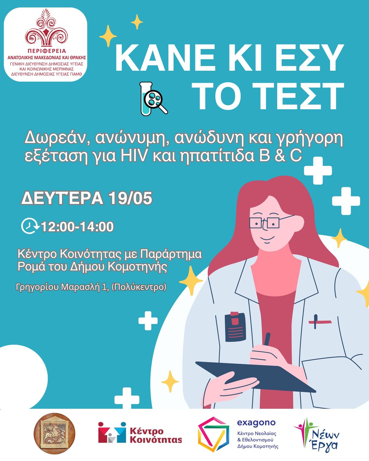 Η Περιφέρεια ΑΜ-Θ -Γενική Διεύθυνση Δημόσιας Υγείας και Κοινωνικής Μέριμνας -Διεύθυνση Δημόσιας Υγείας ΠΑΜΘ και το Κέντρο Νεολαίας και Εθελοντισμού exagono Δήμου Κομοτηνής σε συνεργασία με τον Δήμο Κομοτηνής και το Κέντρο Κοινότητας Παράρτημα Ρομά του Δήμου Κομοτηνής με την κινητή μονάδα του Εθνικού Οργανισμού Δημόσιας Υγείας (ΕΟΔΥ), θα πραγματοποιήσουν δράση που αφορά δωρεάν εξετάσεις ενημέρωσης – ευαισθητοποίησης για την HIV λοίμωξη, τις ηπατίτιδες B και C και άλλα σεξουαλικώς μεταδιδόμενα νοσήματα.