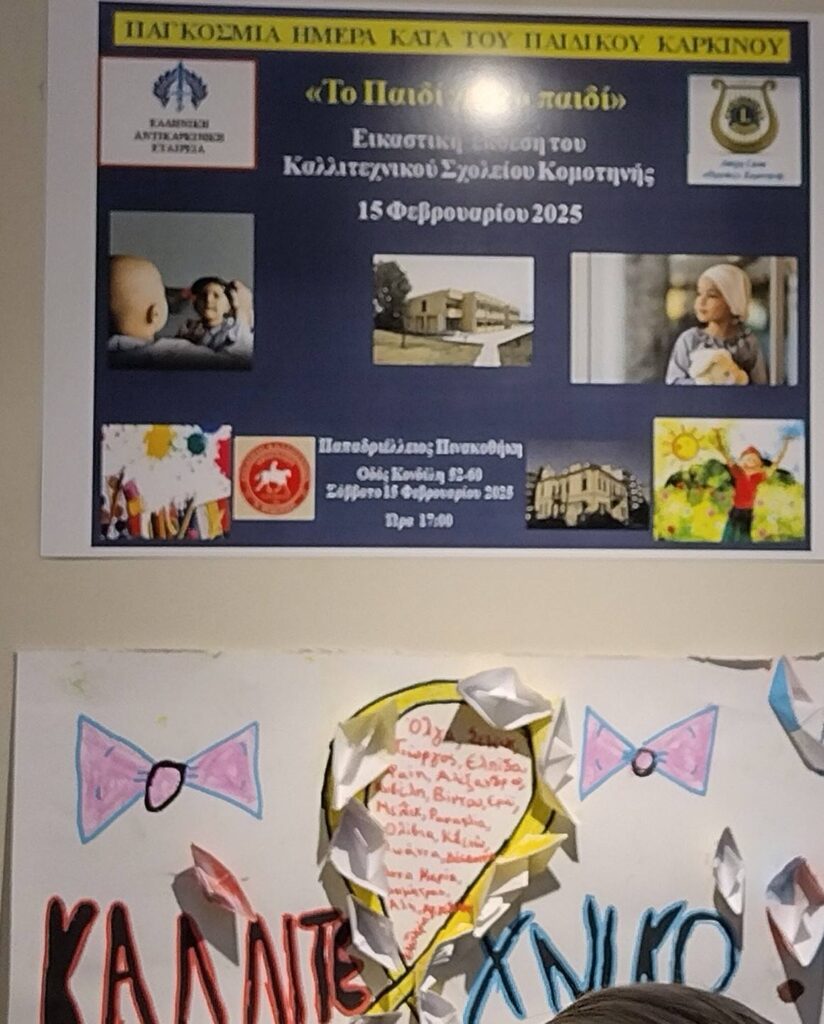 40 εικαστικά έργα των μαθητών του νεοσύστατου Καλλιτεχνικού Σχολείου Νέου Σιδηροχωρίου με θέμα τον παιδικό καρκίνο, φιλοξενεί ο Σύλλογος Καλλιτεχνών Ν Ροδόπης «ΑΘΗΝΙΩΝ», στον πρώτο όροφο της Δημοτικής Παδριελλείου πινακοθήκης, συμβάλλοντας από κοινού με τους μικρούς καλλιτέχνες στην ευαισθητοποίηση των πολιτών για την αντιμετώπιση της νόσου.