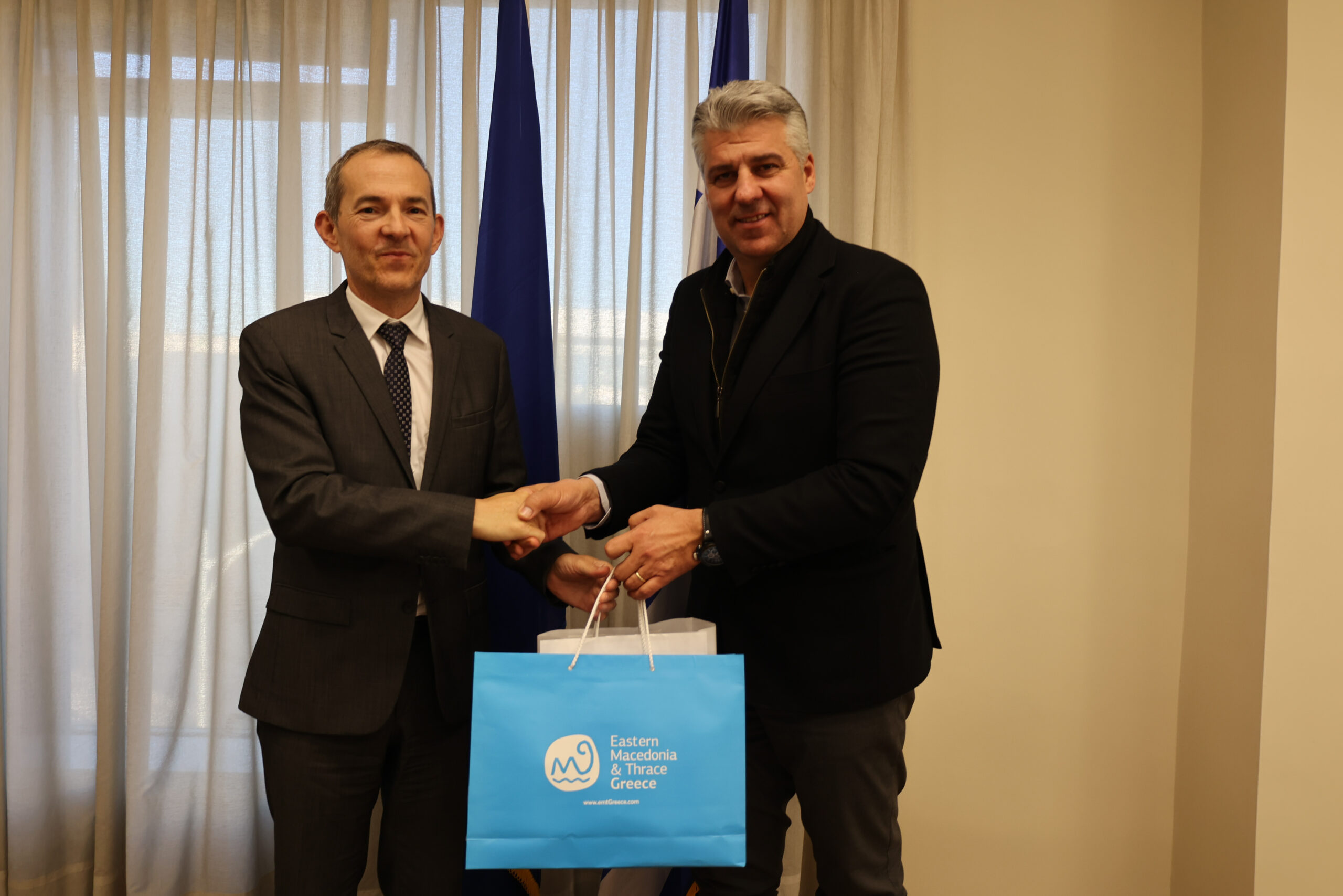 Η συνάντηση έγινε στο πλαίσιο της επίσκεψης στην περιοχή του Γάλλου διπλωμάτη, στον οποίον ο Περιφερειάρχης κος Τοψίδης παρουσίασε το προφίλ της Περιφέρειας Ανατολικής Μακεδονίας και Θράκης, τις προοπτικές και τα πλεονεκτήματα. Η συζήτηση επικεντρώθηκε σε θέματα ανάπτυξης και συνεργασίας με έμφαση στις οικονομικές σχέσεις, τον τουρισμό και τον πολιτισμό, και άλλες πρωτοβουλίες που προάγουν τη συνεργασία, με τον κο Πρόξενο να επιβεβαιώνει το ενδιαφέρον της χώρας του για την Περιφέρεια ΑΜΘ.