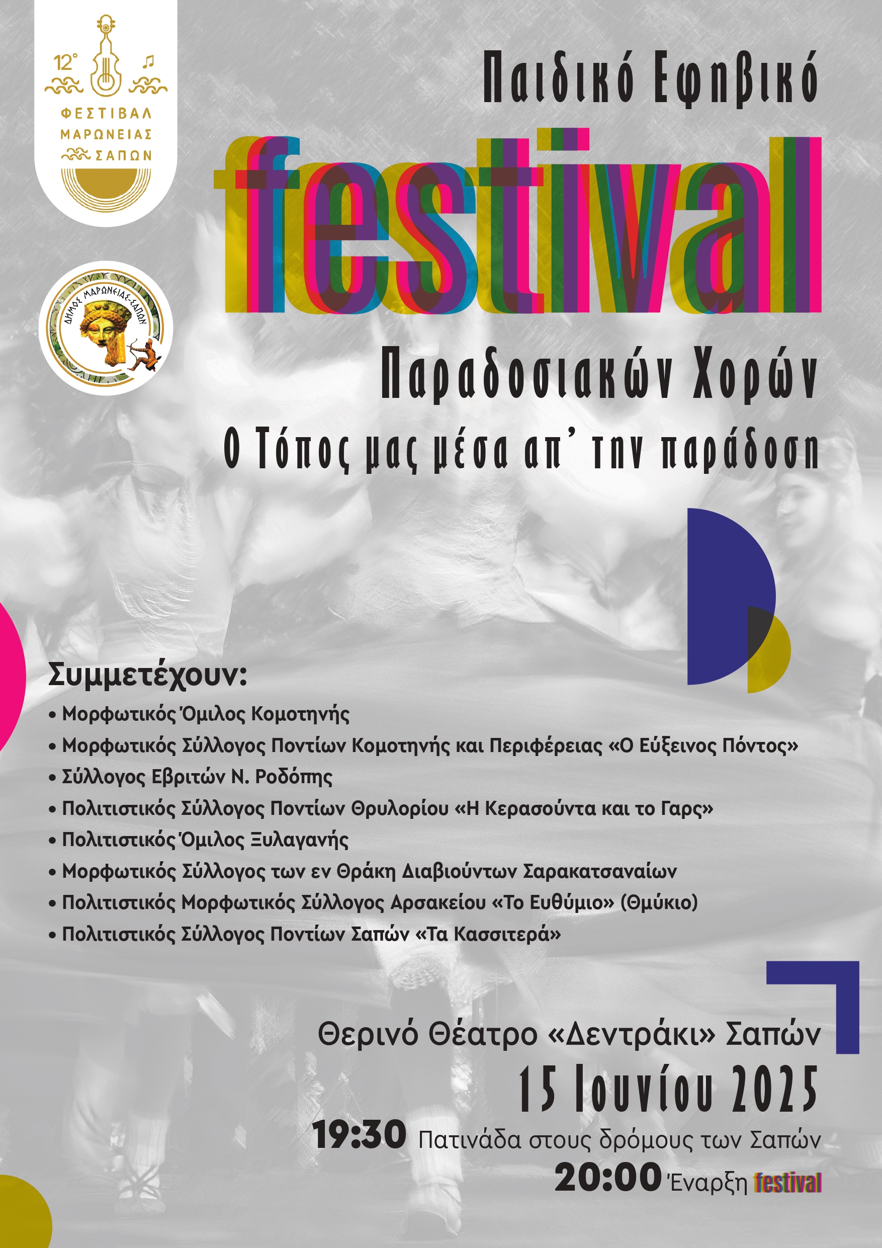 Ο Δήμος Μαρωνείας – Σαπών έχει τη χαρά να ανακοινώσει την έναρξη του 12ου Φεστιβάλ Μαρωνείας-Σαπών 2025 με μια πολύχρωμη, χαρούμενη και αυθεντικά παραδοσιακή εκδήλωση: το Παιδικό-Εφηβικό Φεστιβάλ Παραδοσιακών Χορών, που φέρει τον τίτλο «Ο τόπος μας μέσα από την παράδοση».