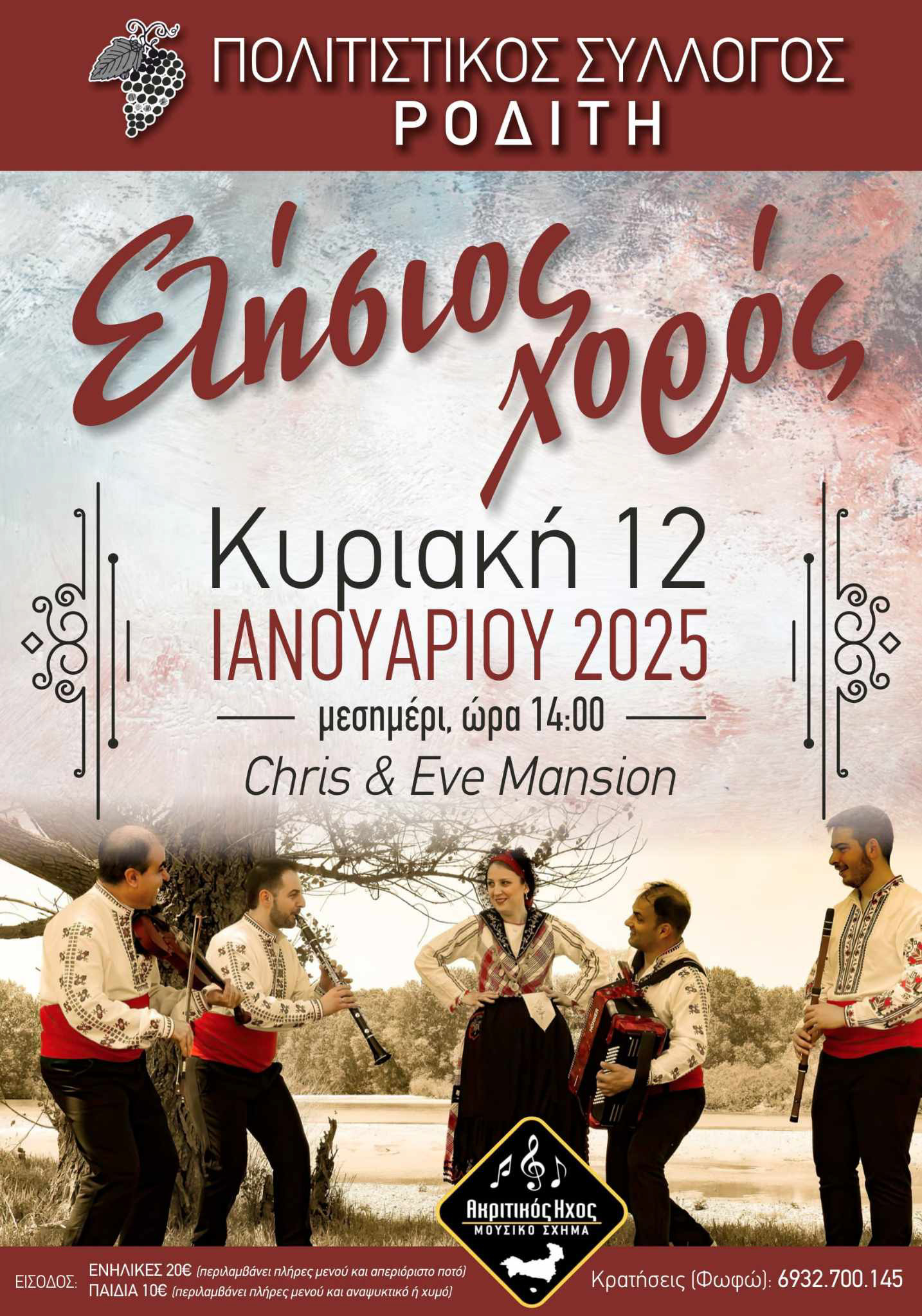 Την Κυριακή 12 Ιανουαρίου 2025 και από ώρα 14:00 στον Ετήσιο Χορό του Πολιτιστικού Συλλόγου Ροδίτη που θα πραγματοποιηθεί στο ξενοδοχείο Χρήστος και Εύη.
