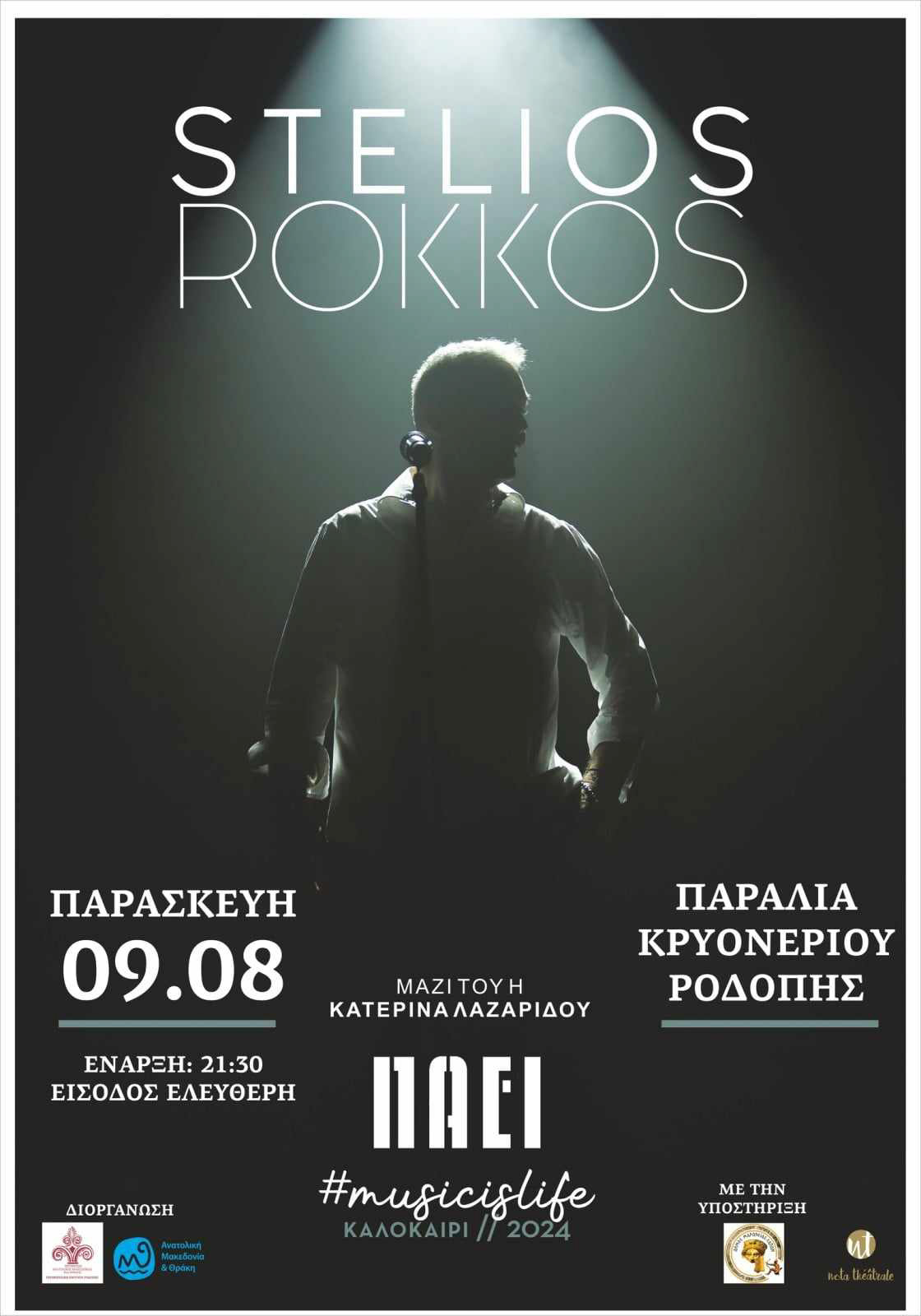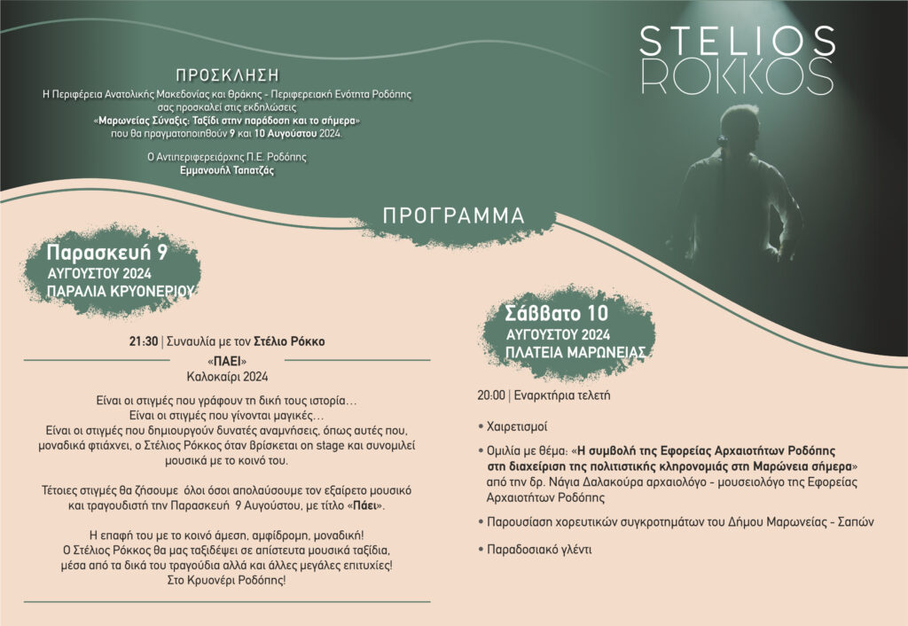 Η Περιφέρεια ΑΜΘ-ΠΕ Ροδόπης σας προσκαλεί στην συναυλία με τον Στέλιο Ρόκκο στην παραλία Κρυονερίου Ροδόπης, με δωρεάν είσοδο