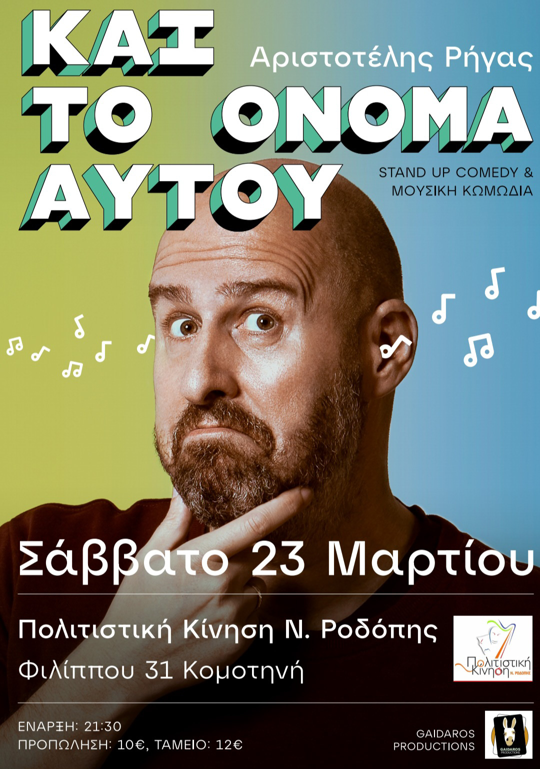Η Πολιτιστική Κίνηση Ν. Ροδόπης υποδέχεται τον Αριστοτέλη Ρήγα , με την παράσταση ‘’ και το όνομα αυτού’’ που αποτελεί κράμα stand-up comedy και μουσικής κωμωδίας.