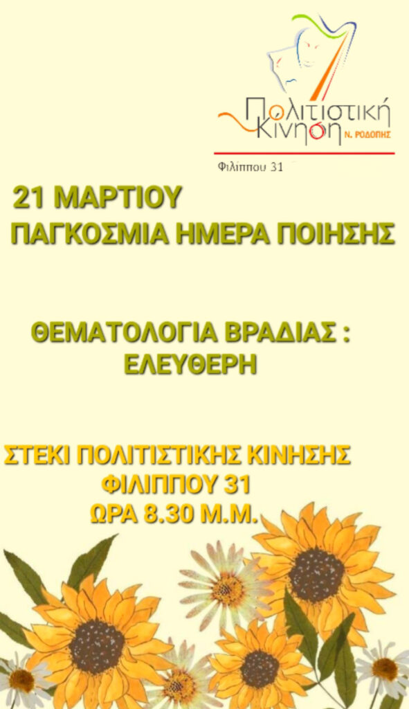 Η Πολιτιστική Κίνηση Ν. Ροδόπης, θα τιμήσει για ακόμα μια χρονιά την Παγκόσμια Ημέρα Ποίησης, την Πέμπτη 21 Μαρτίου, διοργανώνοντας βραδιά ποίησης, στις 20:30, στην αίθουσα του συλλόγου.