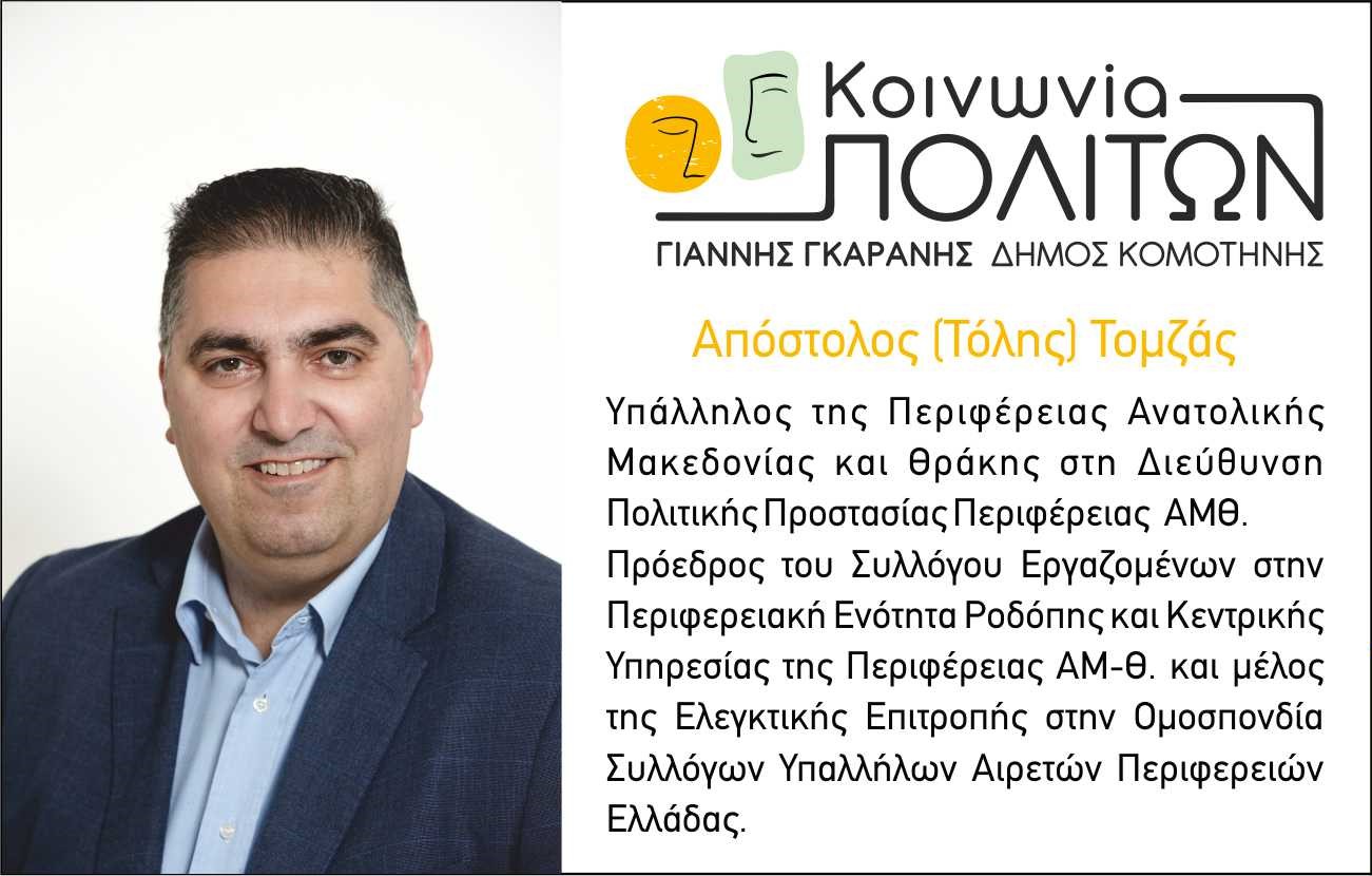 Βρισκόμενος πάντα στην πρώτη γραμμή των έκτακτων καταστάσεων της Περιφέρειας μου τα τελευταία χρόνια ειναι πολλές και εξαιρετικά απαιτητικές ο Απόστολος Τομζάς ,ο Τόλης για τους ανθρώπους που τον γνωρίζουν καλά αποτελεί μία επιλογή για το Δήμο της Κομοτηνής που απαντά στις προκλήσεις των καιρών .