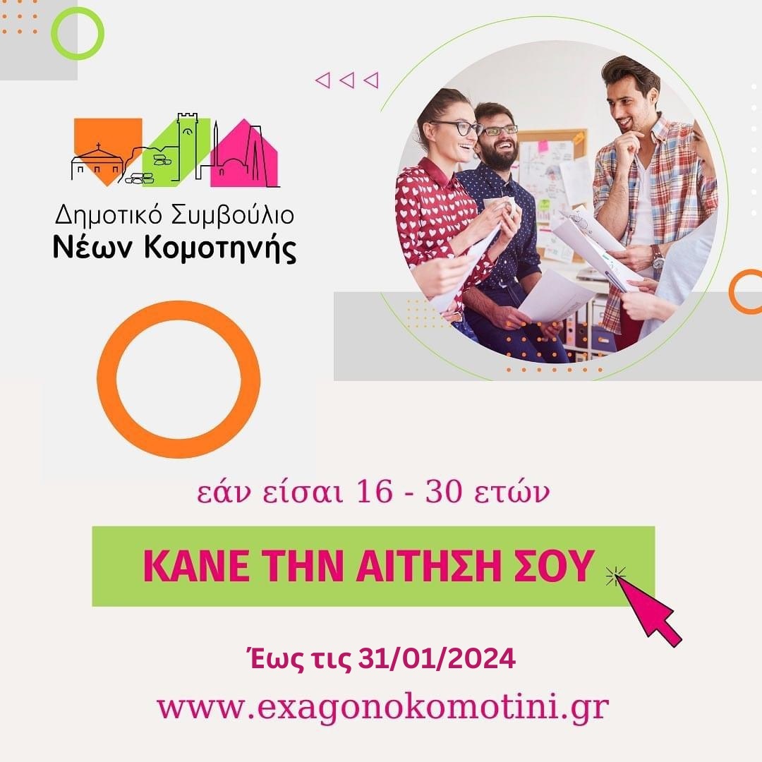 Για τη σύσταση του νέου Δημοτικού Συμβουλίου Νέων Κομοτηνής ενημερώνονται όλοι οι νέοι ηλικίας 16-30 ετών, ότι έχουν ανοίξει οι αιτήσεις υποψηφιότητας.