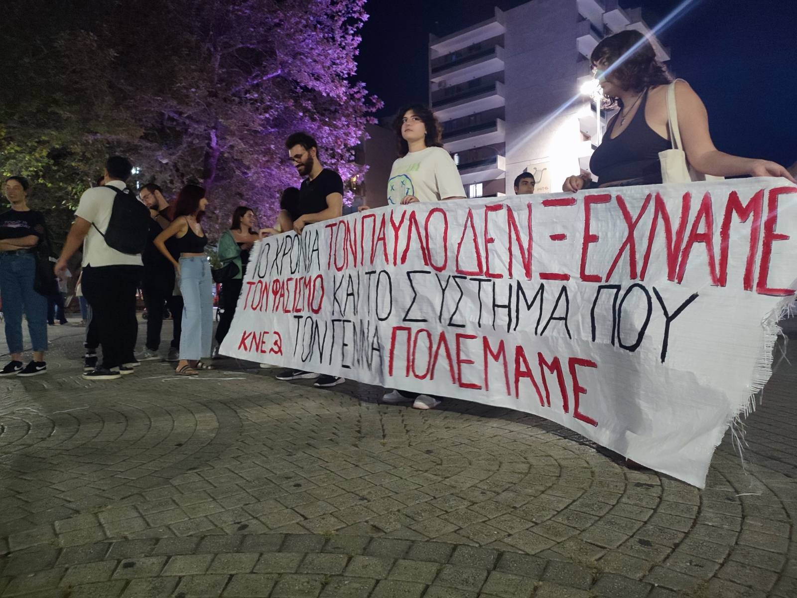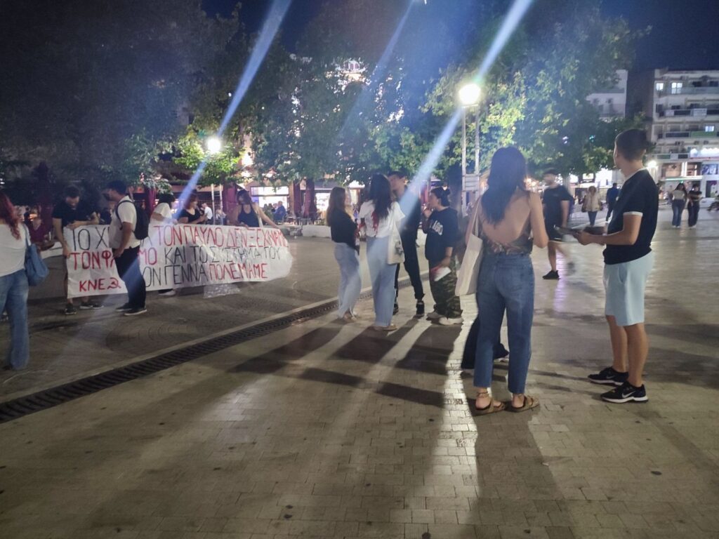 Καθ’ όλη τη διάρκεια της παρέμβασης στην πλατεία ακούγονταν τραγούδια του δολοφονημένου μουσικού, καθώς και άλλα αντιφασιστικά τραγούδια. Τα μέλη της ΚΝΕ ήρθαν σε επαφή με πλήθος φοιτητών μαθητών και νέων εργαζομένων της πόλης μοιράζοντας ανακοινώσεις, “επικοινωνώντας ότι η δολοφονία του Παύλου από μέλος της εγκληματικής φασιστικής οργάνωσης της Χρυσής Αυγής δεν θα ξεχαστεί και ότι όλοι μας πρέπει να πολεμήσουμε τόσο τον φασισμό, όσο και το σύστημα που τον γέννα και τον συντηρεί.” όπως αναφέρει η οργάνωση μεταξύ άλλων σε σχετική ανακοίνωση