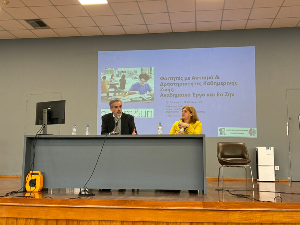 Στη συνέχεια, ο Παναγιώτης Σιαπέρας, επίκουρος καθηγητής του Τμήματος Εργοθεραπείας, παρουσίασε την εισήγηση «Φοιτητές με Αυτισμό και Δραστηριότητες Καθημερινής Ζωής: Ακαδημαϊκό Έργο και Ευ Ζην». Εστίασε στο κοινωνικό και φυσικό περιβάλλον στο οποίο βρίσκονται οι φοιτητές στο φάσμα του αυτισμού, στις προκλήσεις της φοιτητικής ζωής, στη σημασία κατάλληλων δομών υποστήριξης και στην καθοδήγηση που απαιτείται τόσο για τους φοιτητές όσο και για τους διδάσκοντες, ώστε να επιτυγχάνεται μία ομαλή μετάβαση στην πανεπιστημιακή πραγματικότητα.