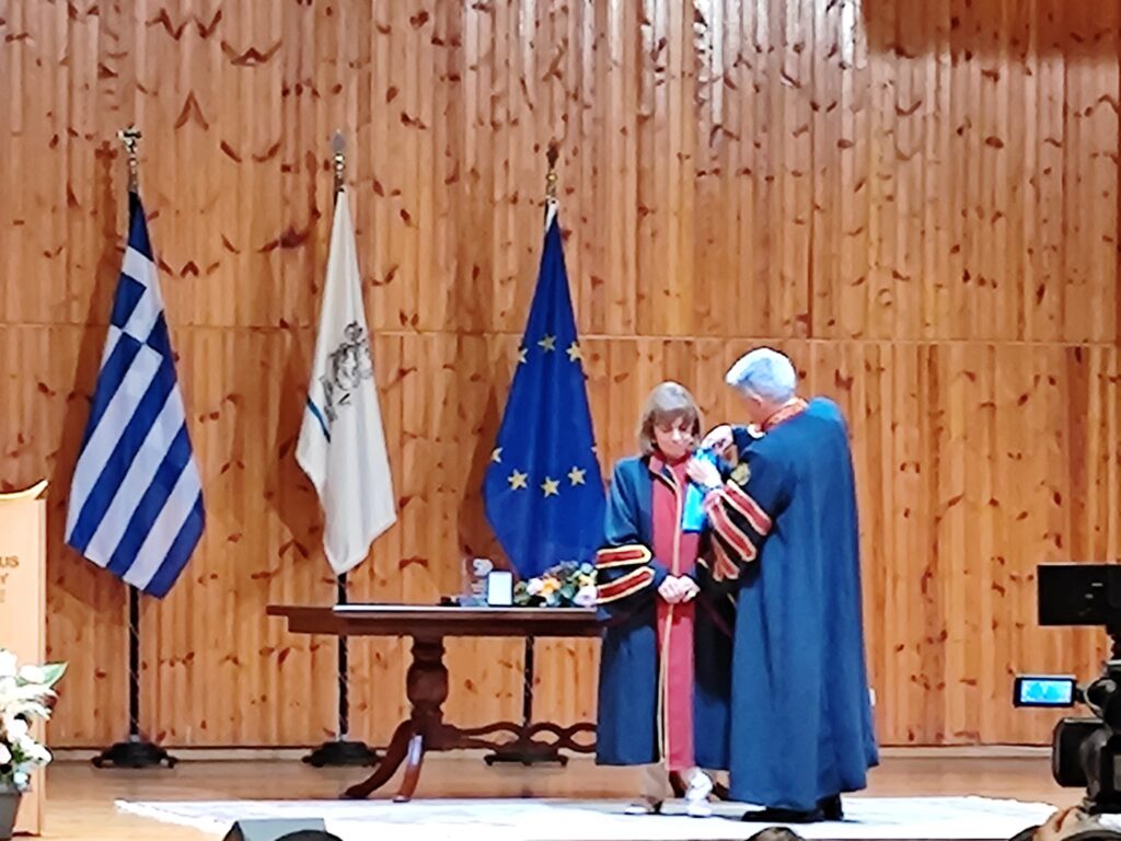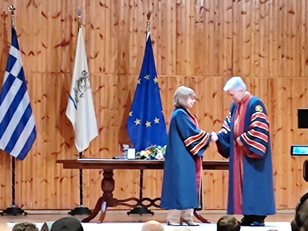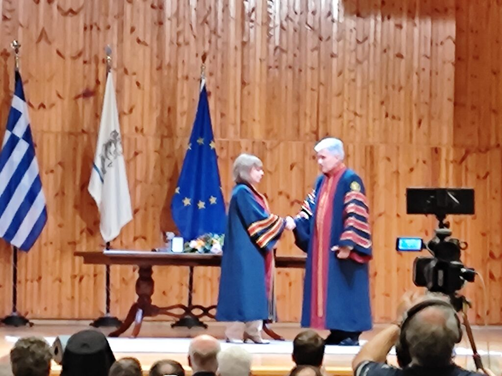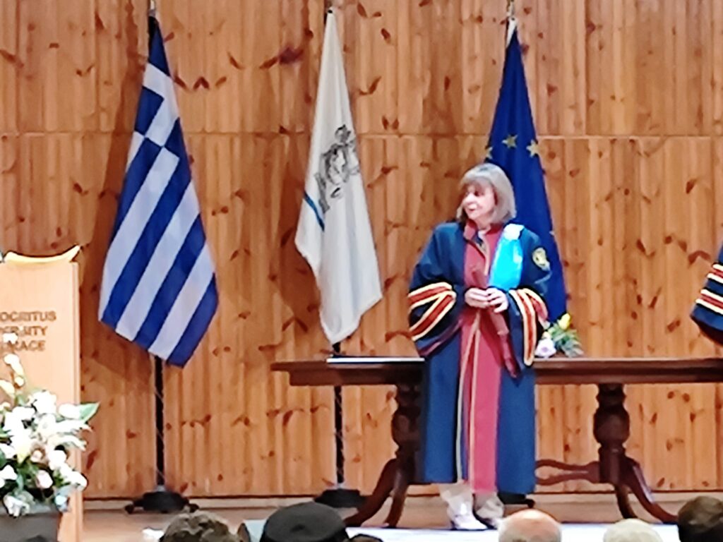 Στη συνέχεια υπήρξε ανάγνωση του Ψηφίσματος, της Αναγόρευσης και του Διδακτορικού Διπλώματος από τον Πρόεδρο του Τμήματος Πολιτικής Επιστήμης Αναπληρωτή Καθηγητή Κωνσταντίνο Δικαίο και περιένδυση της τιμωμένης από τον Πρύτανη του Δ.Π.Θ.