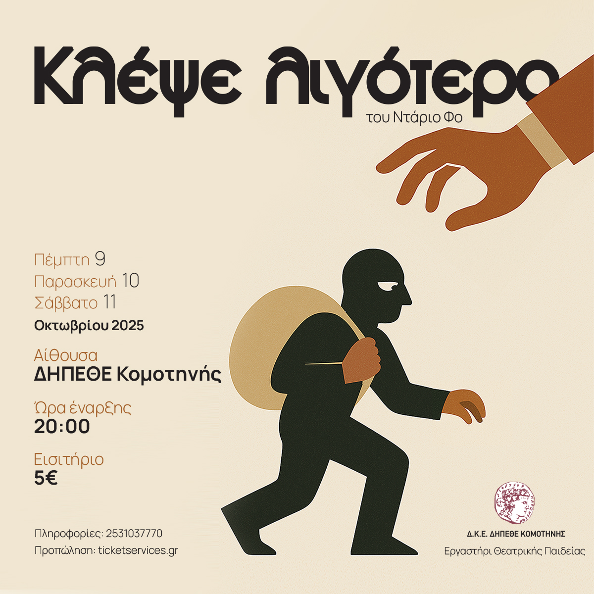 “Κλέψε λιγότερο” του Ντάριο Φο παρουσιάζεται εκ νέου για 3 παραστάσεις στο ΔΗΠΕΘΕ κομοτηνής