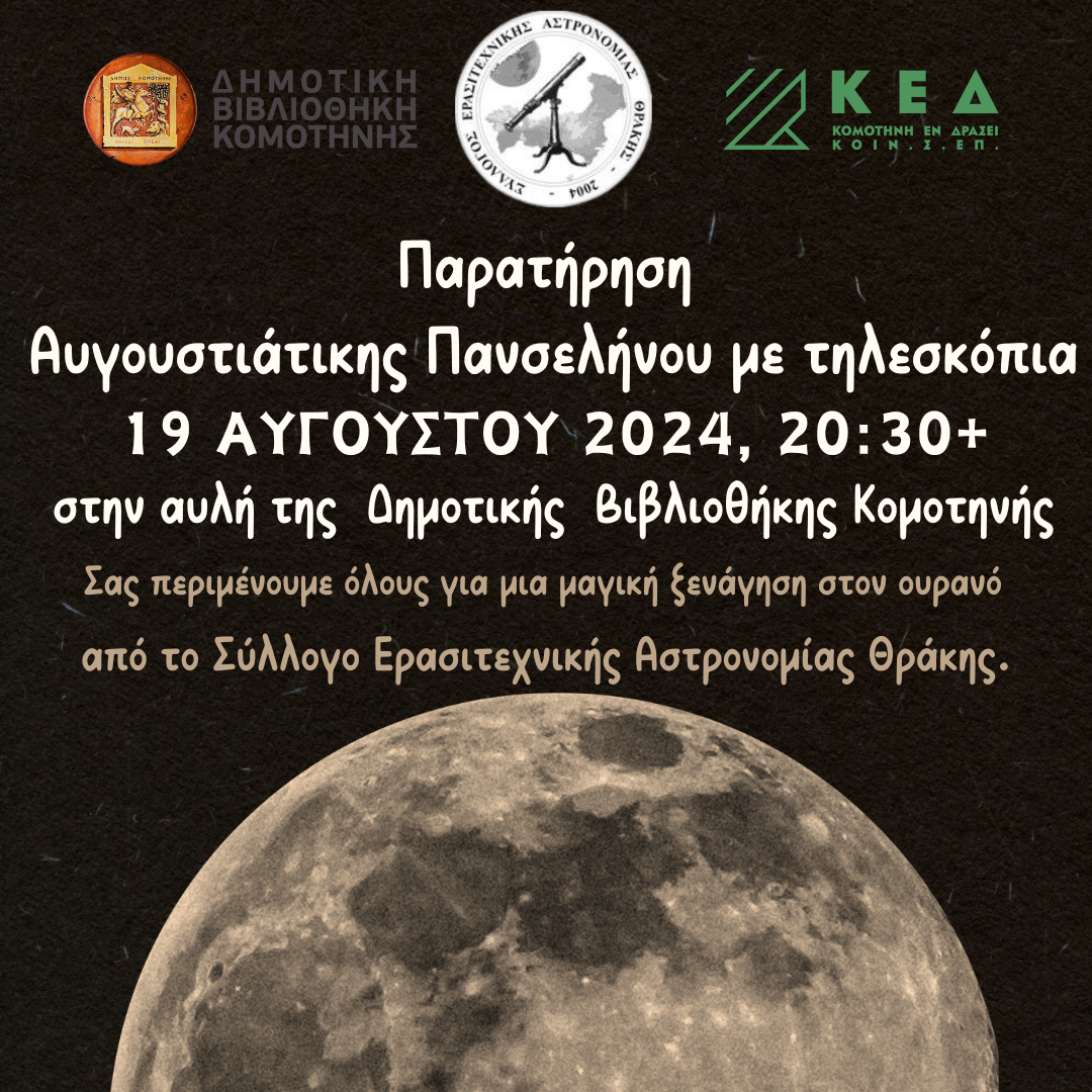 H Δημοτική Βιβλιοθήκη Κομοτηνής στο πλαίσιο των δράσεων που υλοποιούνται με την ΚΟΙΝΣΕΠ «Κομοτηνή Εν Δράσει» και ο Σύλλογος Ερασιτεχνικής Αστρονομίας Θράκης σας προσκαλούν στη παρατήρηση της Πανσελήνου του Αυγούστου με τηλεσκόπια, τη Δευτέρα 19 Αυγούστου 2024, 20:30 στην αυλή της Δημοτικής Βιβλιοθήκης Κομοτηνής Δευτέρα 19 Αυγούστου , με την ανατολή της Σελήνης, μετά τις 20:30 στην αυλή της Δημοτικής Βιβλιοθήκης Κομοτηνής.Σας περιμένουμε όλους για μια μαγική ξενάγηση στον ουρανό της Αυγουστιάτικης Πανσελήνου!