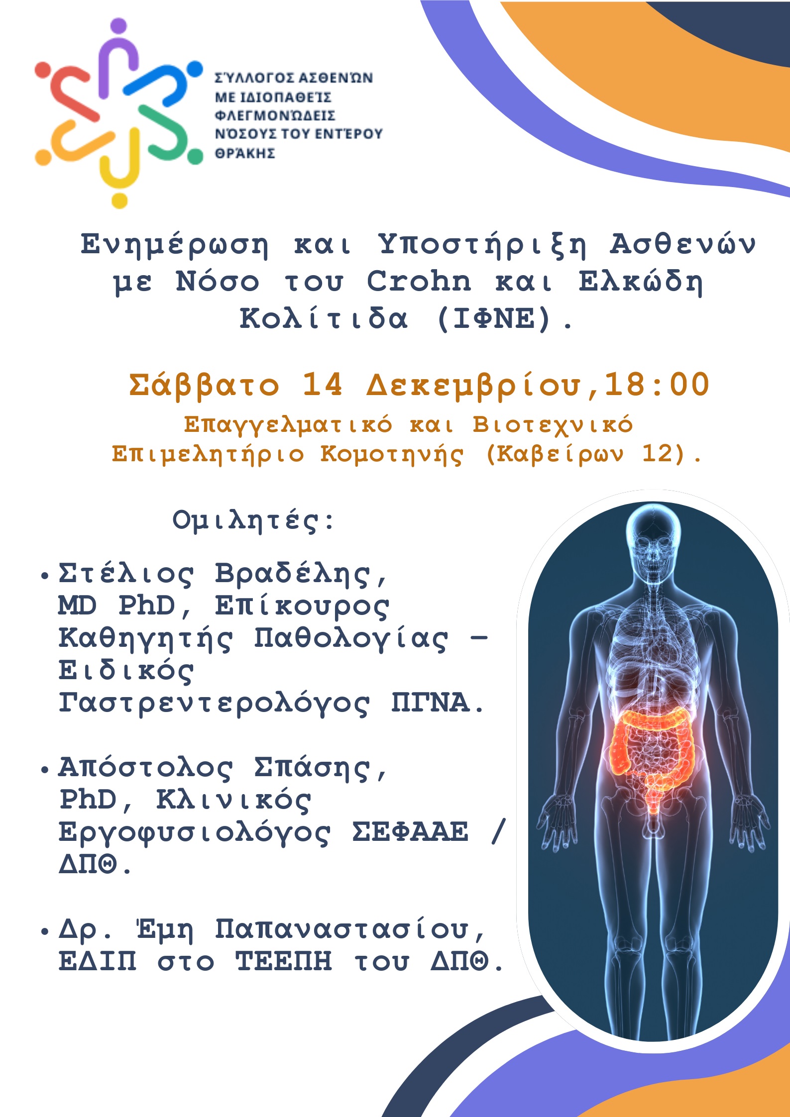 Ο Σύλλογος Ασθενών με νόσο του Crohn και Ελκώδη Κολίτιδα (ΙΦΝΕ) Θράκης πραγματοποιεί το Σάββατο 14 Δεκεμβρίου 2024 στις 6 μ.μ. στο Επαγγελματικό και Βιοτεχνικό Επιμελητήριο Ροδόπης (Καβείρων 12) εκδήλωση με θέμα «Ενημέρωση και Υποστήριξη Ασθενών με Νόσο του Crohn και Ελκώδη Κολίτιδα (ΙΦΝΕ)». Στην εκδήλωση θα συμμετέχουν ο Στέλιος Βραδέλης, MD PhD, Επίκουρος Καθηγητής Παθολογίας – Ειδικός Γαστρεντερολόγος ΠΓΝΑ, ο Απόστολος Σπάσης, PhD, Κλινικός Εργοφυσιολόγος ΣΕΦΑΑE / ΔΠΘ και η Δρ. Έμη Παπαναστασίου, ΕΔΙΠ στο ΤΕΕΠΗ του ΔΠΘ.