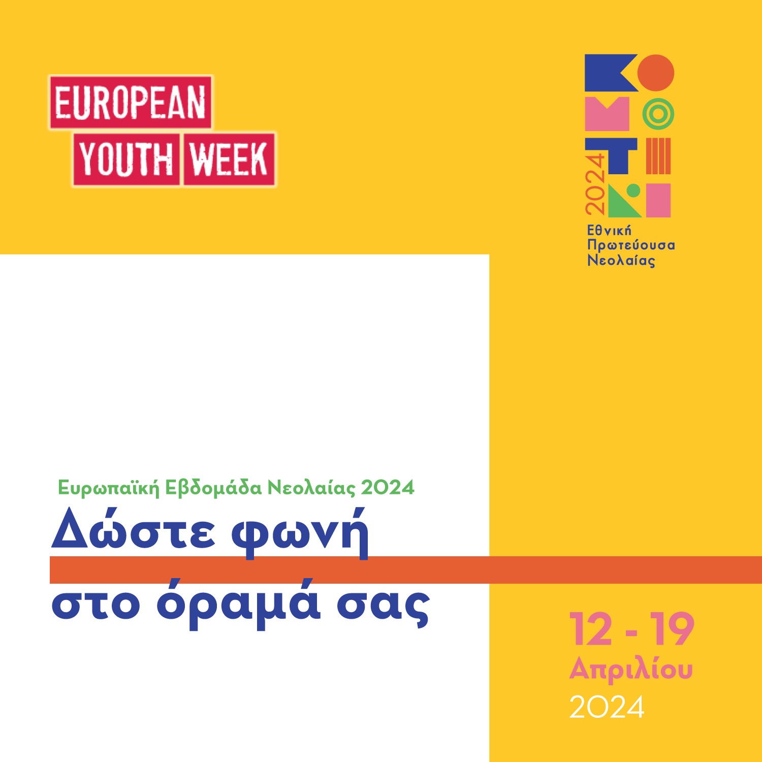 Στο πλαίσιο της Εθνικής Πρωτεύουσας Νεολαίας 2024, και στη διάρκεια της Ευρωπαϊκής Εβδομάδας Νεολαίας απο 12 έως 19 Απριλίου, ο Δήμος Κομοτηνής, το Κέντρο Νεολαίας και Εθελοντισμού exagono Δήμου Κομοτηνής, φορείς, σχολεία, σύλλογοι, οργανώσεις και άτυπες ομάδες διοργανώνουν δράσεις και εκδηλώσεις με σκοπό την ενημέρωση, ευαισθητοποίηση, την ενεργή συμμετοχή των νέων και την αλληλεπίδραση τους με την τοπική κοινωνία.