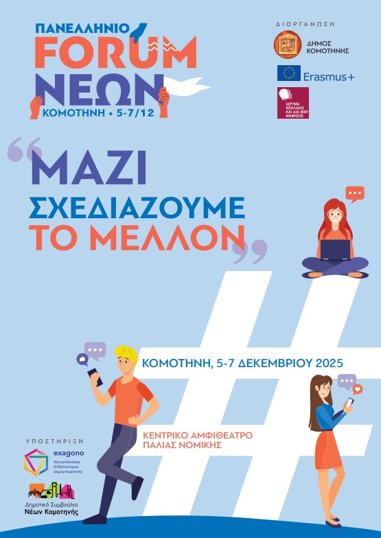 Ο Δήμος Κομοτηνής, στο πλαίσιο του ευρωπαϊκού προγράμματος Youth Think City Links που υλοποιείται μέσω του Erasmus+ Youth, διοργανώνει το Πανελλήνιο Forum Νέων “Μαζί Σχεδιάζουμε το Μέλλον”, στην Κομοτηνή στις 5–7 Δεκεμβρίου 2025, στο αμφιθέατρο της Παλιάς Νομικής Κομοτηνής.