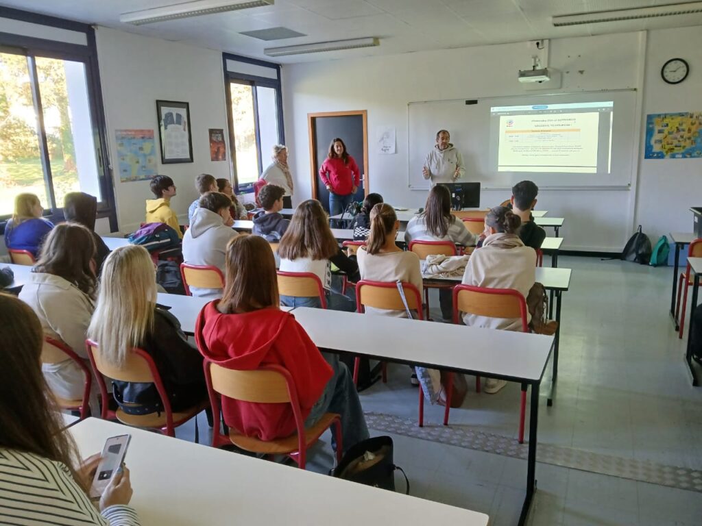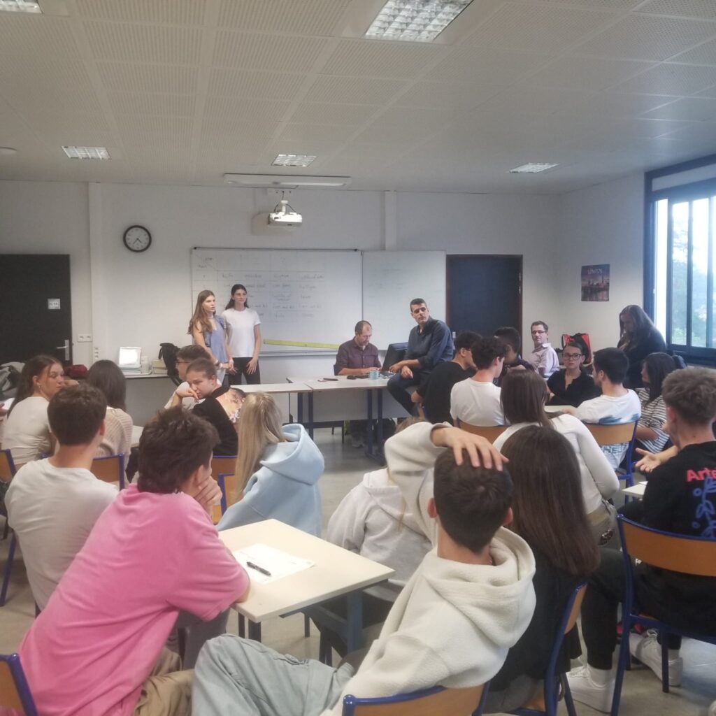 Η πρώτη ημέρα περιλάμβανε τελετή υποδοχής στο σχολείο και το δημαρχείο της πόλης, καθώς και περιήγηση στο Mourenx (δημοτική βιβλιοθήκη, δημαρχείο, γυμνάσιο). Οι μαθητές συμμετείχαν σε δραστηριότητες γνωριμίας και παρουσίασαν μέσα από βίντεο και διαφάνειες τη χώρα, την πόλη και το σχολείο τους.