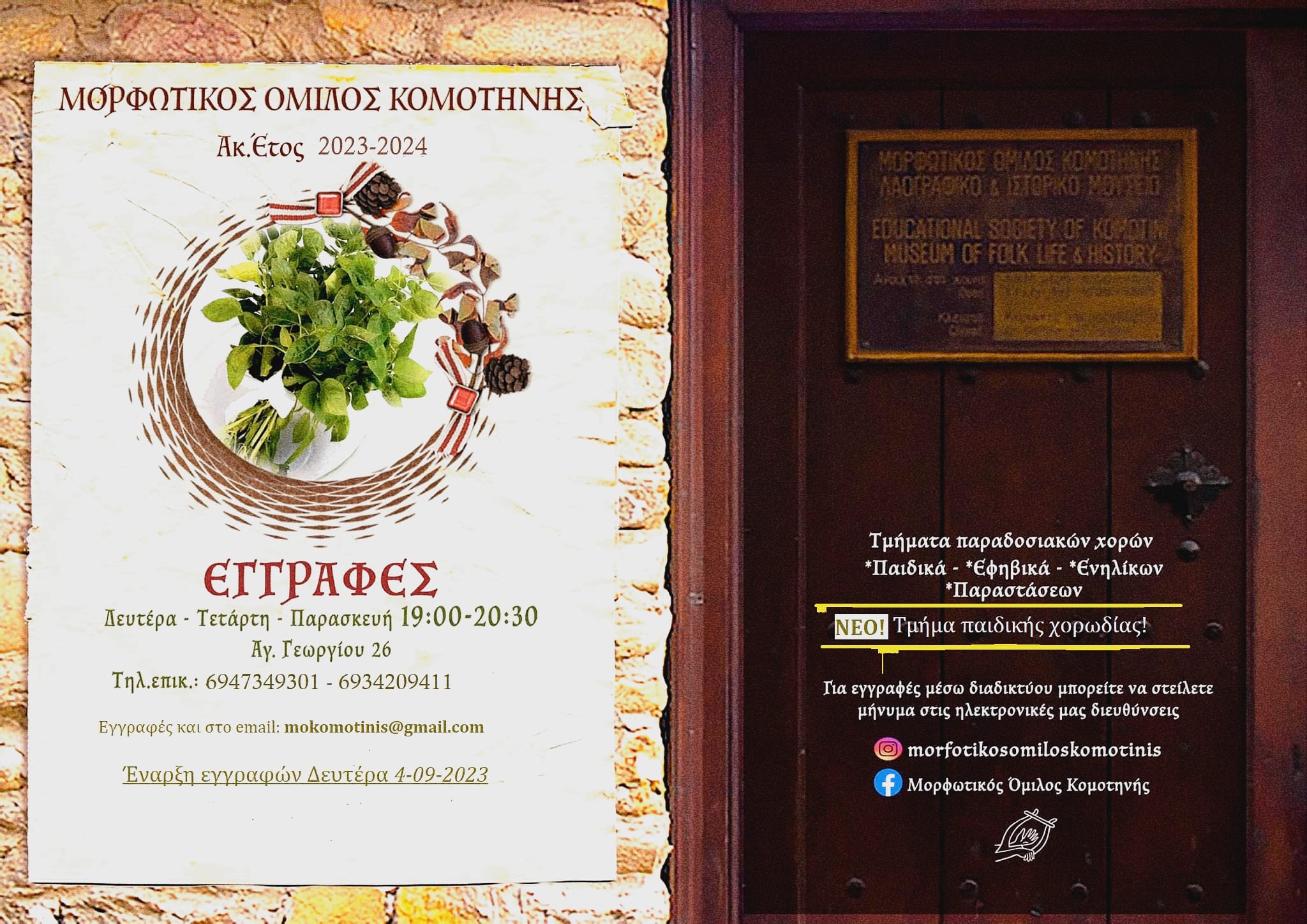 Οι εγγραφές θα ξεκινήσουν στις 4 Σεπτεμβρίου 2023, στο Εντευκτήριο του Ομίλου (Αγ. Γεωργίου 26) κάθε Δευτέρα, Τετάρτη και Παρασκευή και ώρες 19:00 – 20:30, στα τηλέφωνα 6947349301 – 6934209411 και στο mokomotinis@gmail.com