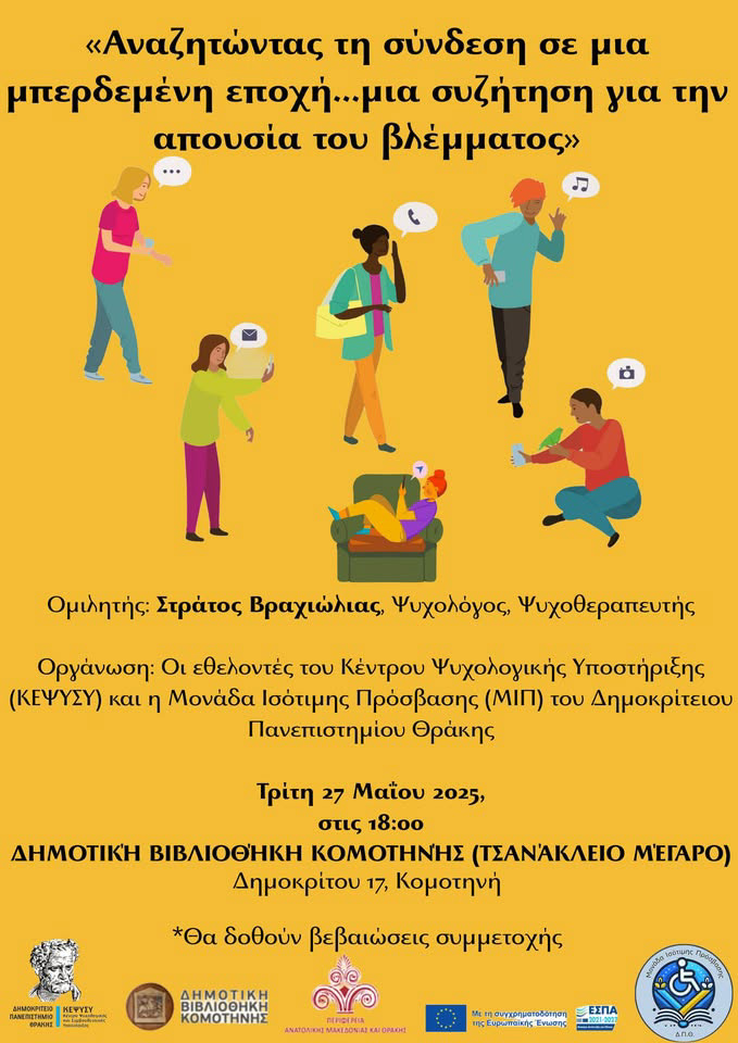 Την Τρίτη 27 Μαΐου στον εσωτερικό χώρο της Δημοτικής βιβλιοθήκης Koμοτηνής πραγματοποιήθηκε εκδήλωση με τίτλο «Αναζητώντας τη σύνδεση σε μια μπερδεμένη εποχή…μια συζήτηση για την απουσία του βλέμματος» και κεντρικό ομιλητή τον κ. Στράτο Βραχιώλια, ψυχολόγο- ψυχοθεραπευτή.