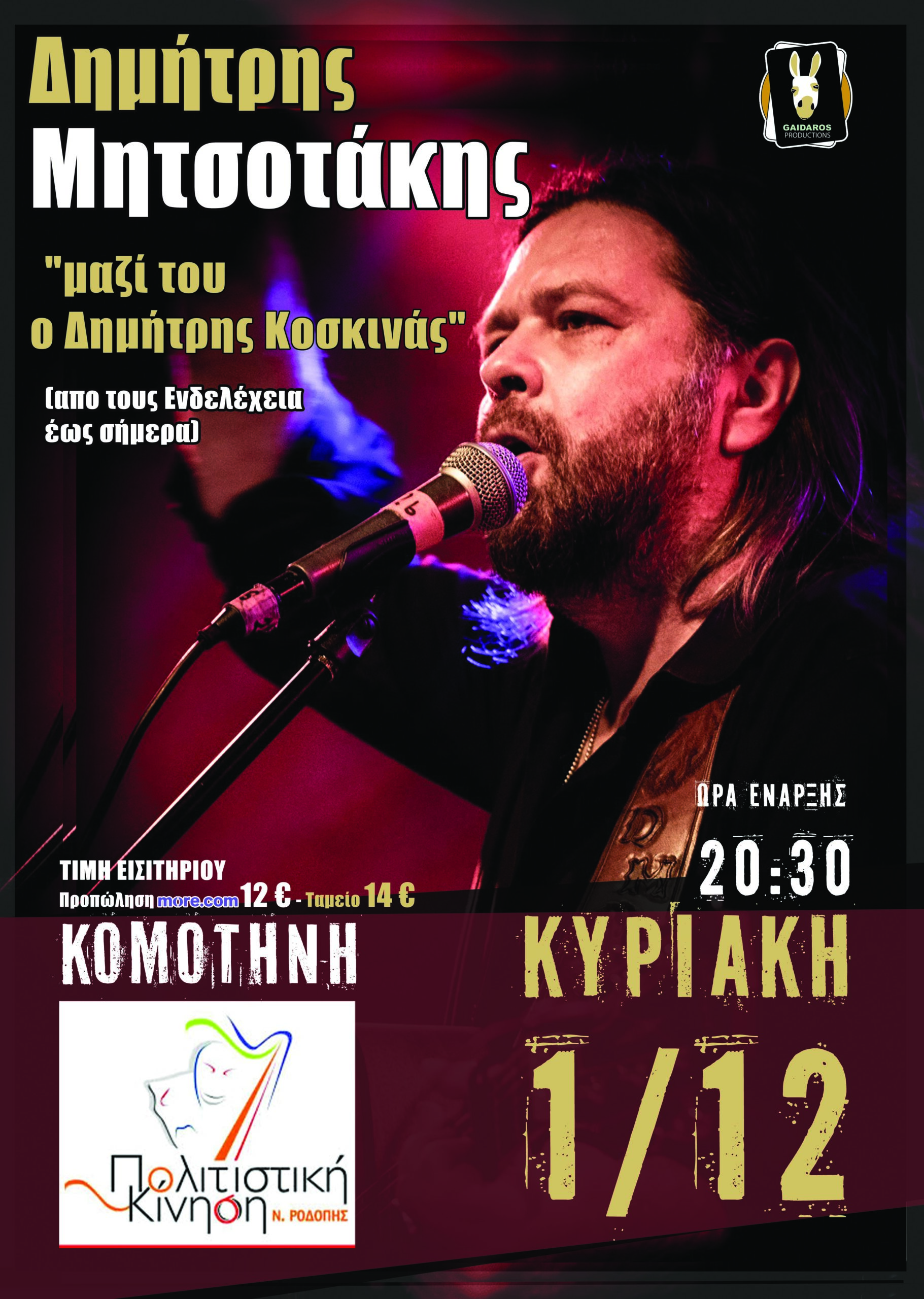 Την Κυριακή 1 Δεκεμβρίου και ώρα 8.30 μμ φιλοξενείται στη στέγη της Πολιτιστικής Κίνησης Ν. Ροδόπης (Φιλίππου 31) ο συνθέτης, στιχουργός και συγγραφέας Δημήτρης Μητσοτάκης, ευρύτερα γνωστός από το συγκρότημα «Ενδελέχεια» που υπήρξε ένα από τα επιδραστικότερα αλλά και δημοφιλέστερα σχήματα της δεκαετίας του ’90. Πρόκειται για έναν από τους μεγαλύτερους ροκ στιχουργούς και τραγουδοποιούς της γενιάς του, που φέρνει στη σκηνή ένα πρόγραμμα βασισμένο στην 30ετή δημιουργική του πορεία, μια πορεία αδιαπραγμάτευτη και ασυμβίβαστη. Με 14 δισκογραφικά άλμπουμ και αρκετές ανεξάρτητες διαδικτυακές κυκλοφορίες στο ενεργητικό του, ξεκινώντας από την εποχή των “Βουτιά από ψηλά”, “Δεν είμαι αυτός που θες”, “Τι τραγούδι να σου πω”, “Διαμαντένια προβλήτα”, περνάει μέσα από τις νεότερες αναζητήσεις των Ευδαιμονικών “Αν” και “Ρώτα” και φτάνει στη σημερινή προσωπική του διαδρομή που εκφράζεται με τα νέα του ψηφιακά σινγκλ, για τα οποία συνεργάστηκε με σπουδαίους σύγχρονους ερμηνευτές και μουσικούς.Σας περιμένουμε για μία συναυλία- γιορτή !!Εισιτήρια: 12 προπώληση (more.com)// 14 ταμείοLink : https://www.more.com/music/dimitris-mitsotakis-on-tour/?_gl=1%2A8p43lr%2A_up%2AMQ..&gclid=Cj0KCQjw1Yy5BhD-ARIsAI0RbXYJLhmvEh5ORPYstEPNG4e2jPPRoHNNYNvKrKVFBhOvGHKiDS2GNokaAjp_EALw_wcB&fbclid=IwY2xjawGyxLBleHRuA2FlbQIxMAABHaXG5EYv533sHiZOqpoWqiypsnWjo1DTPpFQG73m3T-NmJryHEdm0w6Q_g_aem_V64kqaXABxHjrNIeS4eQvg