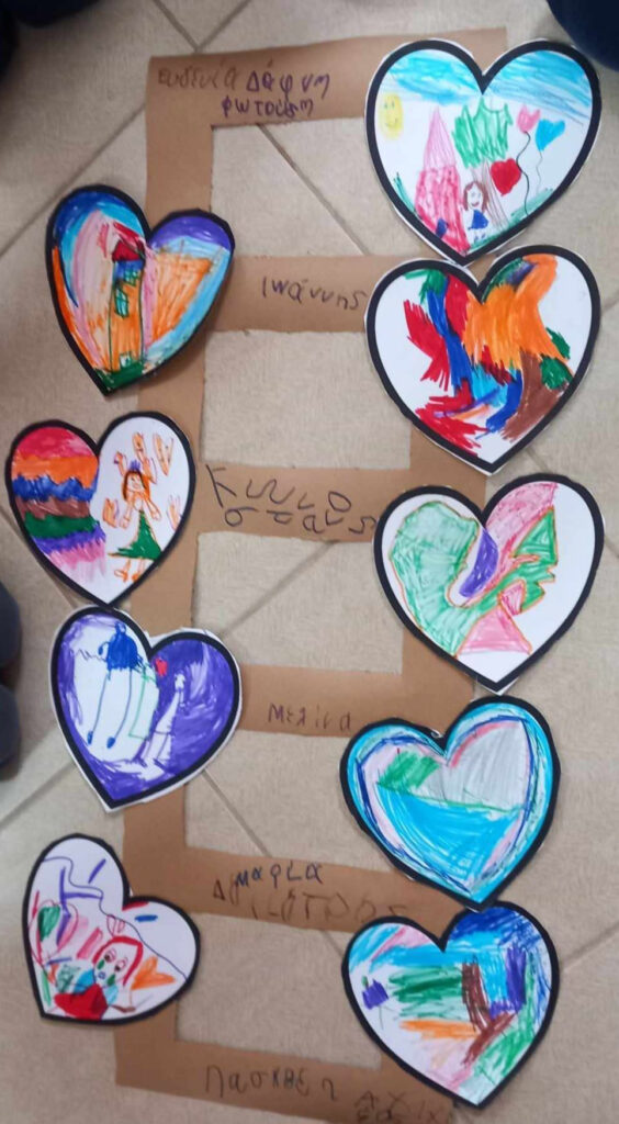 Οι εργαζόμενες του Βοήθεια στο Σπίτι Αιγείρου χάρισαν παιδικά βιβλία για την βιβλιοθήκη του Νηπιαγωγείου και τα παιδιά έκαναν ζωγραφιές που σχημάτιζαν τη «Σκάλα της Αγάπης».