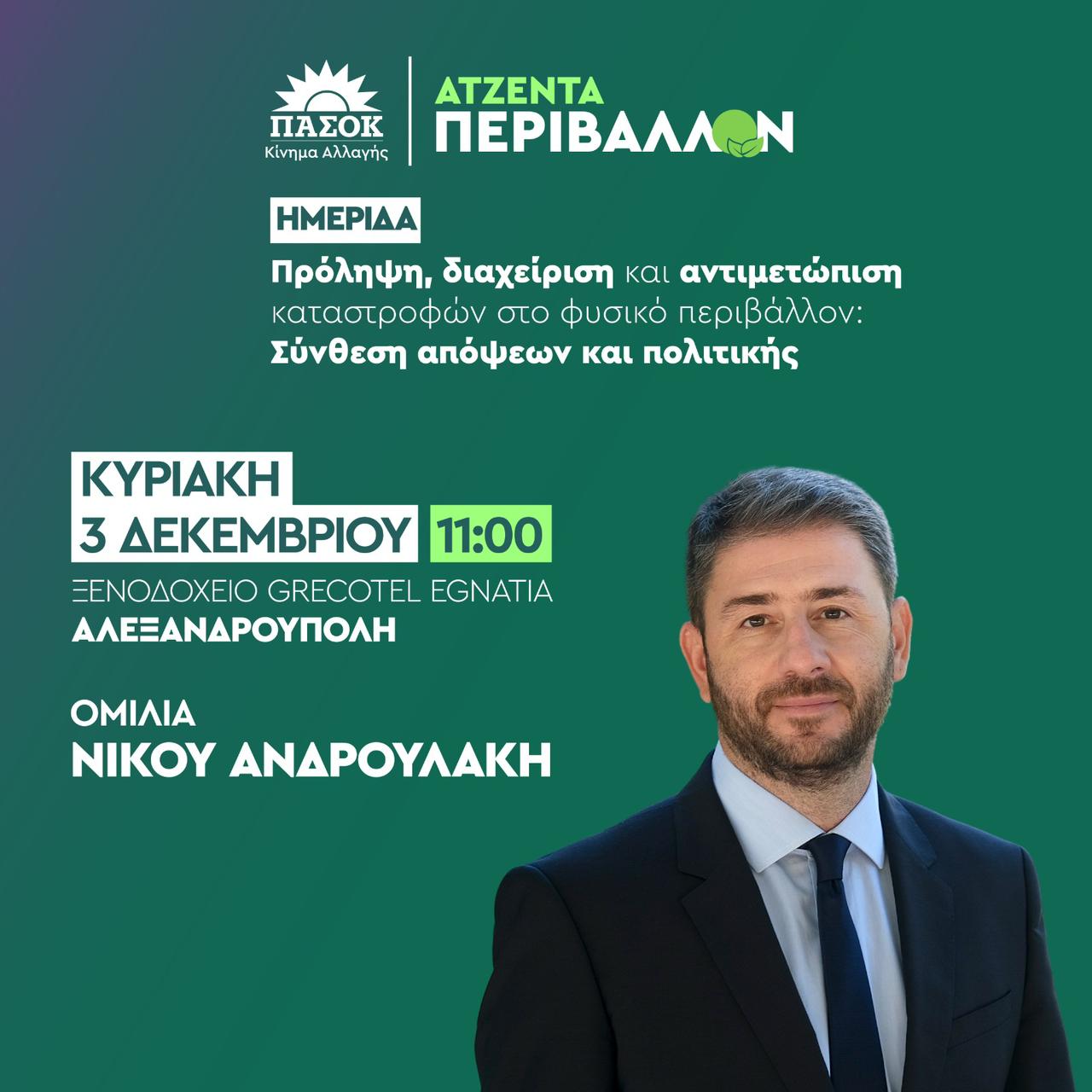 Ημερίδα στα πλαίσια της AGENDA ”Περιβάλλον”, διοργανώνει το ΠΑΣΟΚ – Κίνημα Αλλαγής και ο Τομέας Περιβάλλοντος του ΠΑΣΟΚ – Κινήματος Αλλαγής στην Αλεξανδρούπολη την Κυριακή 3 Δεκεμβρίου 2023 στο ξενοδοχείο GRECOTEL EGNATIA με θέμα την πρόληψη, τη διαχείριση και την αντιμετώπιση των καταστροφών στο φυσικό περιβάλλον .
