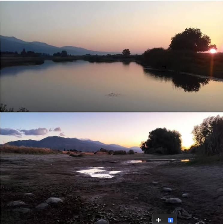 Ροδόπη κλιματική αλλαγή.Ποταμος Κομψάτος: η πάνω φωτογραφία του 2018 , ίδια εποχή και η κάτω σημερινή, από το ίδιο σημείο.