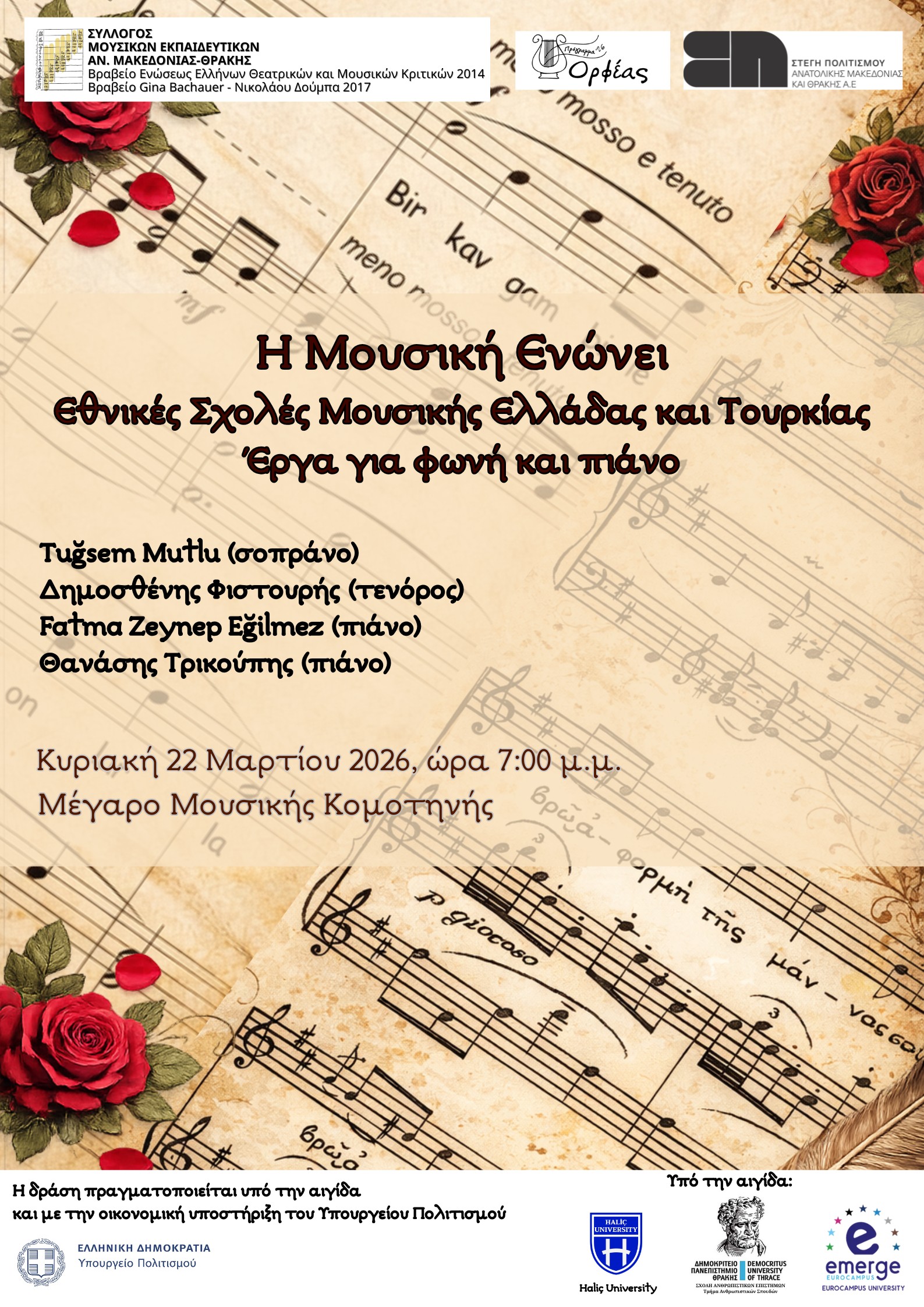Στέγη Πολιτισμού ΠΑΜΘ: Εθνικές Σχολές Μουσικής Ελλάδας και Τουρκίας – έργα για φωνή και πιάνο στο Μέγαρο Μουσικής Κομοτηνής-Κυριακή 22 Μαρτίου
