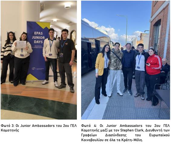 — υπήρξαν συνταξιδιώτες στο «ταξίδι» του ευρωπαϊκού κοινοβουλευτισμού, συμμετέχοντας στο πρώτο EPAS Junior Days, που πραγματοποιήθηκε στις 27–28 Φεβρουαρίου 2026 στο Porto Palace Hotel, στη Θεσσαλονίκη, στο πλαίσιο του προγράμματος «Σχολεία Πρέσβεις του Ευρωπαϊκού Κοινοβουλίου» (EPAS).