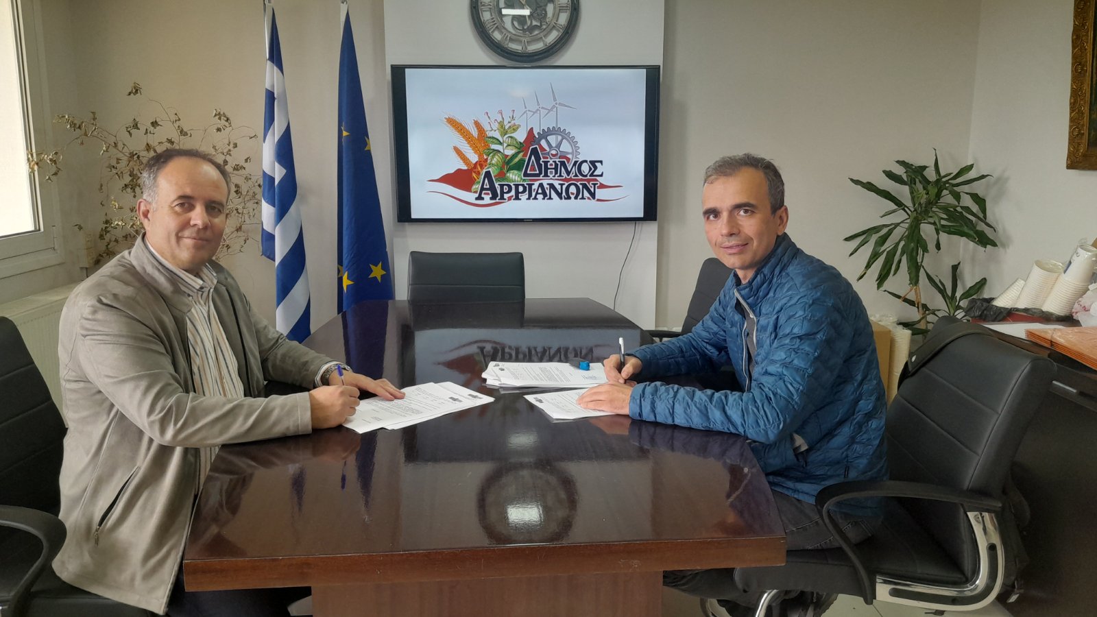 Υπεγράφη σήμερα μεταξύ του δημάρχου Αρριανών και της αναδόχου εταιρείας, η σύμβαση εκτέλεσης του έργου οδοποιίας του Δήμου Αρριανών «Βελτίωση υφιστάμενων δρόμων πρόσβασης σε γεωργική γη και κτηνοτροφικές εκμεταλλεύσεις Δήμου Αρριανών» με χρηματοδότηση από το Πρόγραμμα «ΑΝΤΩΝΗΣ ΤΡΙΤΣΗΣ» και προϋπολογισμό 1.157.995,20€.