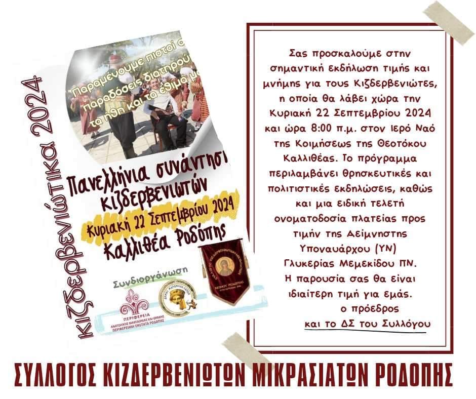 Την Κυριακή, 22 Σεπτεμβρίου 2024, στις 8:00 π.μ., στον Ιερό Ναό της Κοιμήσεως της Θεοτόκου Καλλιθέας, θα πραγματοποιηθεί η εκδήλωση προς τιμήν των απογόνων Κιζδερβενιωτών Ελλάδος. Η εκδήλωση αυτή τιμά την ιστορία και την πολιτιστική κληρονομιά των Κιζδερβενιωτών και συνδυάζει τη μνήμη με την ελπίδα για το μέλλον.