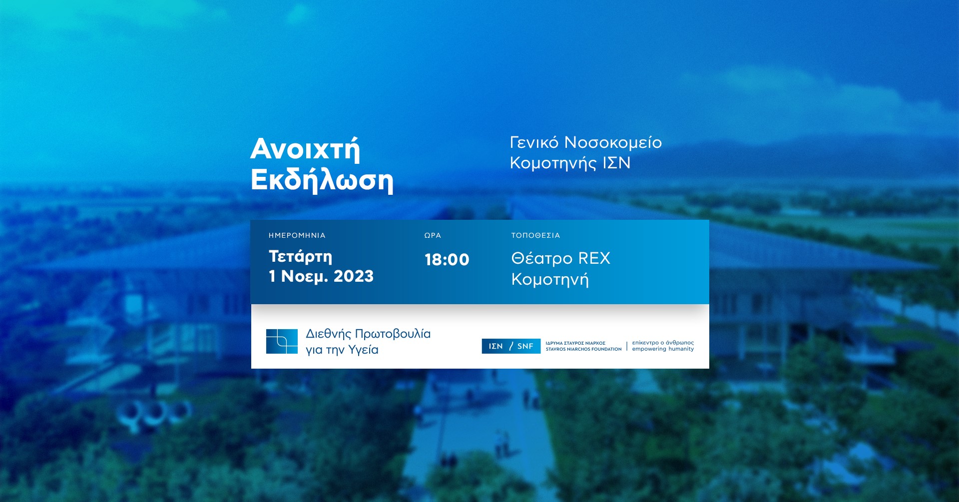 Η εκδήλωση είναι ανοιχτή και ελεύθερη σε όλους/ες χωρίς προεγγραφή. Οι δωρεές για τον σχεδιασμό, την ανέγερση και τον εξοπλισμό του νέου υπερσύγχρονου Γενικού Νοσοκομείου ΙΣΝ στην Κομοτηνή, καθώς και του Πανεπιστημιακού Παιδιατρικού Νοσοκομείου Θεσσαλονίκης IΣΝ και του νέου Γενικού Νοσοκομείου Σπάρτης ΙΣΝ εντάσσονται στο πλαίσιο της Διεθνούς Πρωτοβουλίας για την Υγεία (ΔΠΥ) που χρηματοδοτείται εξ ολοκλήρου από το ΙΣΝ, με συνολικό προϋπολογισμό που υπερβαίνει το ποσό του $1 δισεκατομμυρίου.
