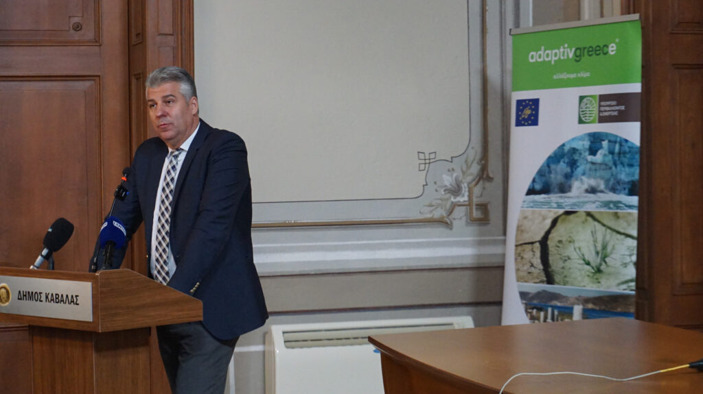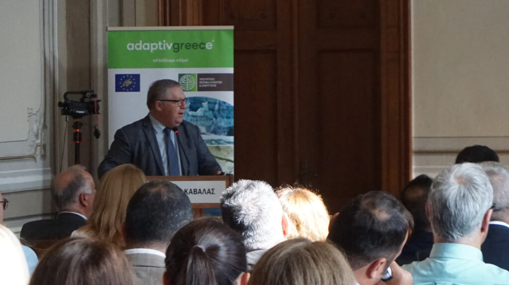 Στο πλαίσιο της ημερίδας υπήρξε εισήγηση και του Αντιπεριφερειάρχη Καβάλας Δρ. Μαρκόπουλου που παρουσίασε το σύνολο των επιπτώσεων της Κλιματικής Αλλαγής στην Περιφέρεια ΑΜΘ και ειδικότερα στην Π.Ε. Καβάλας. Ειδικότερα αναφέρθηκε στο φαινόμενο της λειψυδρίας και στις συνέπειες που έχει στον πρωτογενή τομέα αλλά και στο εισόδημα των παραγωγών, στις ξηρές καταιγίδες που έγιναν η αιτία για πυρκαγιές στην Θάσο και την Καβάλα, αλλά και στην διάβρωση των ακτών. Ο κ. Μαρκόπουλος παρέθεσε σε γλαφυρό ύφος τα «συμπτώματα» της Κλιματικής Αλλαγής στην Π.Ε. Καβάλας και στην Π.Ε. Θάσου σε όλους τους τομείς, τονίζοντας ότι για να είναι συμμέτοχος ο πολίτης στην προσπάθεια μας πρέπει να δούμε τα θέματα όπως τα βιώνει και τα νοιώθει ο ίδιος στην δουλειά και στην καθημερινότητά του.