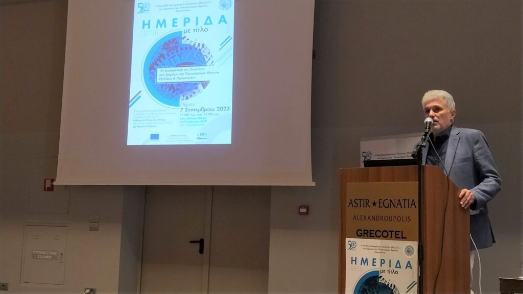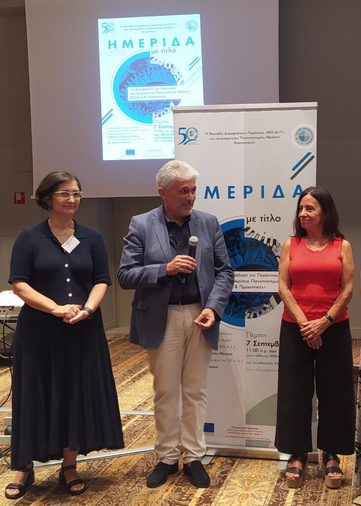 Με επιτυχία ολοκληρώθηκε η ημερίδα με τίτλο: «Η Διασφάλιση της Ποιότητας στο Δημοκρίτειο Πανεπιστήμιο Θράκης – Εξελίξεις και Προοπτικές» που οργανώθηκε από τη Μονάδα Διασφάλισης Ποιότητας (ΜΟ.ΔΙ.Π) του Δ.Π.Θ. στο πλαίσιο της υλοποίησης του έργου «Υποστήριξη της ΜΟ.ΔΙ.Π του ΔΠΘ» που έγινε τηνΠέμπτη 7 Σεπτεμβρίου 2023 στην Αλεξανδρούπολη.