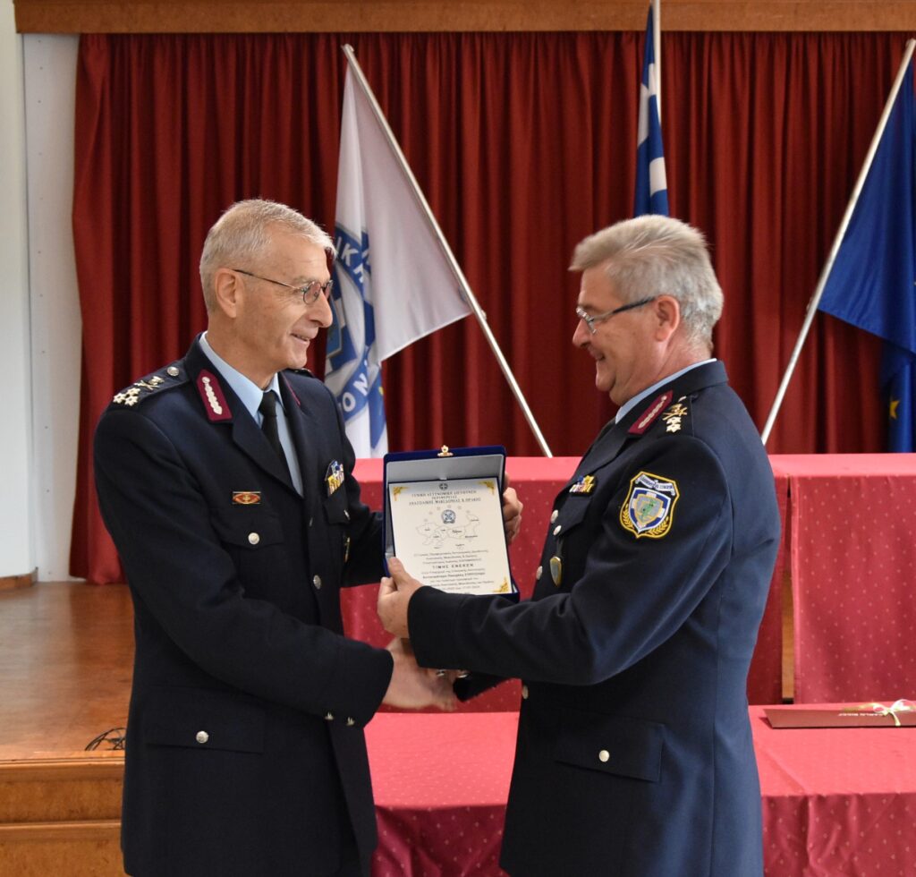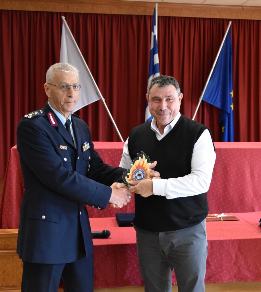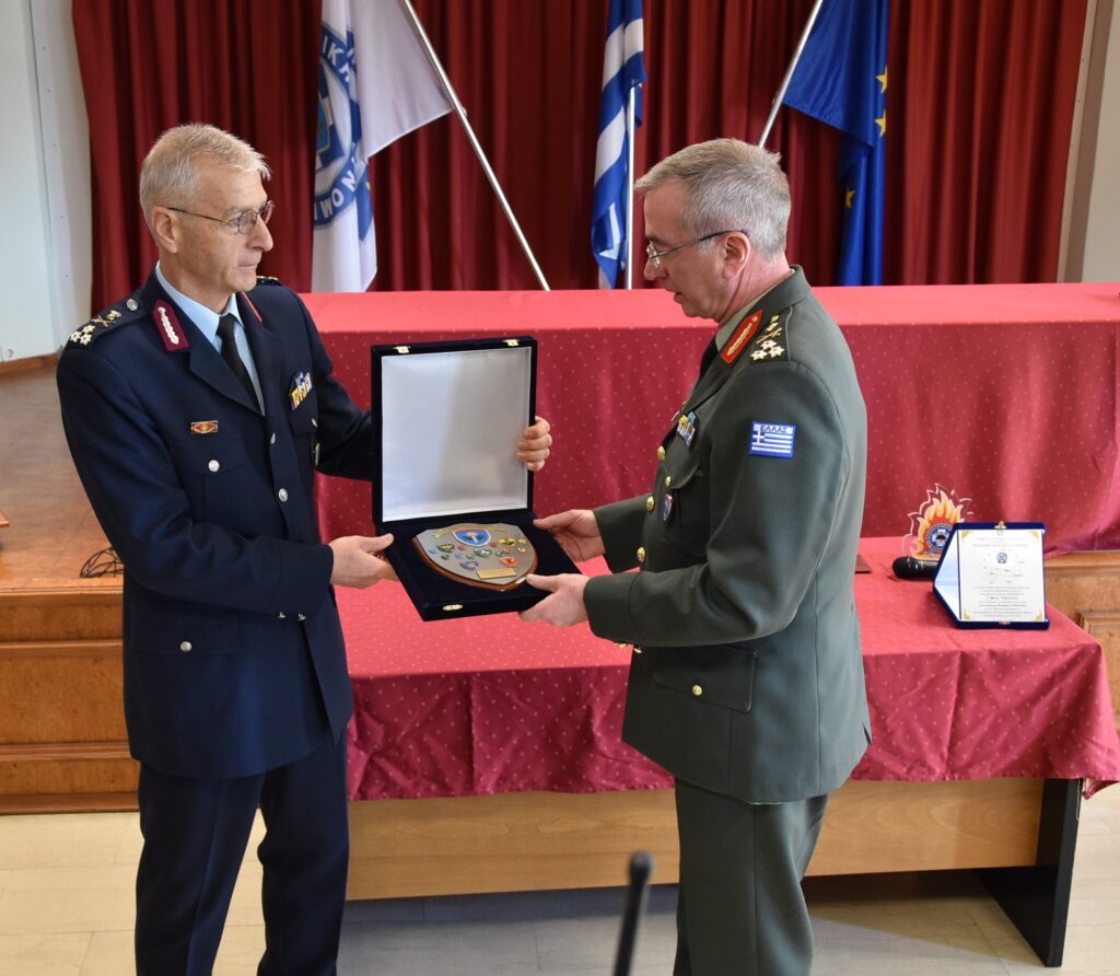 Ο Διοικητής του Δ΄ Σώματος Στρατού Αντιστράτηγος Σταύρος Παπασταθόπουλος και ο πρώην Διοικητής της Περιφερειακής Διοίκησης Πυροσβεστικής Υπηρεσίας Ανατολικής Μακεδονίας και Θράκης Αντιστράτηγος ε.α. Κωνσταντίνος Κούκουρας απένειμαν αναμνηστικές πλακέτες στον Υπαρχηγό της Ελληνικής Αστυνομίας Αντιστράτηγο Πασχάλη Συριτούδη.