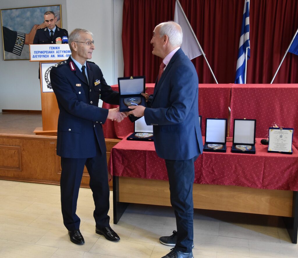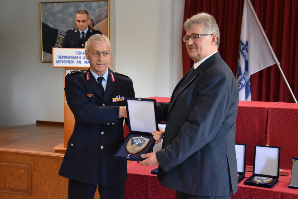 Ακολούθως, ο Γενικός Περιφερειακός Αστυνομικός Διευθυντής Ανατολικής Μακεδονίας και Θράκης, Υποστράτηγος Ιωάννης Καραμανλής απένειμε αναμνηστική πλακέτα, στον απερχόμενο Γενικό Περιφερειακό Αστυνομικό Διευθυντή Ανατολικής Μακεδονίας και Θράκης, ως ελάχιστη ένδειξη αναγνώρισης του πολύπλευρου, ουσιαστικού και αποτελεσματικού έργου που επιτέλεσε, τα τελευταία τέσσερα χρόνια, στην Περιφέρεια Ανατολικής Μακεδονίας και Θράκης.