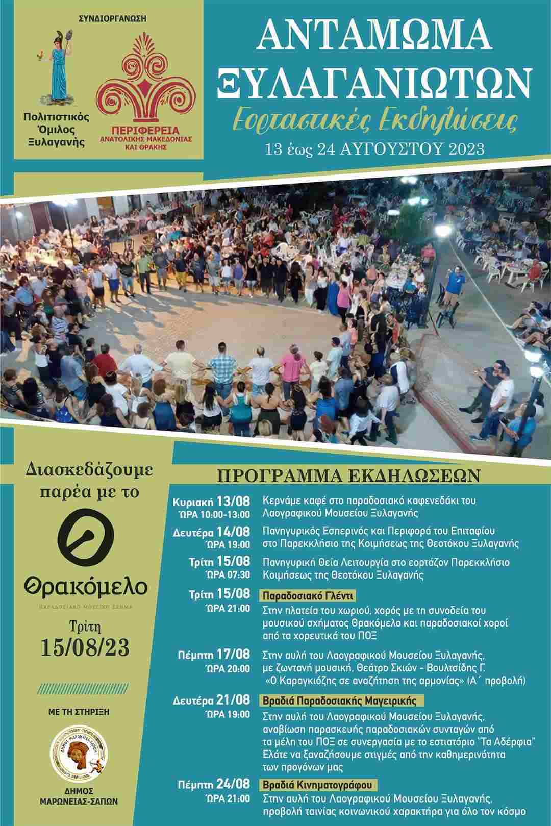Η Περιφέρεια Ανατολικής Μακεδονίας και Θράκηςσε συνεργασία με τον Πολιτιστικό Όμιλο Ξυλαγανής και τη στήριξη του Δήμου Μαρωνείας – Σαπών, σας προσκαλούν στις εορταστικές εκδηλώσεις που θα πραγματοποιηθούν στην Ξυλαγανή από 13 έως 24 Αυγούστου 2023, όπως αυτές εμφανίζονται στο συνημμένο πρόγραμμα.