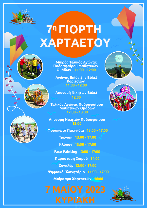 Σας ενημερώνουμε για το αναλυτικό πρόγραμμα της «7ης Γιορτής Χαρταετού» που διοργανώνει ο Δήμος Αρριανών την Κυριακή 07 Μάϊου 2023 στον χώρο των αθλητικών εγκαταστάσεων του γηπέδου Αρριανών.
