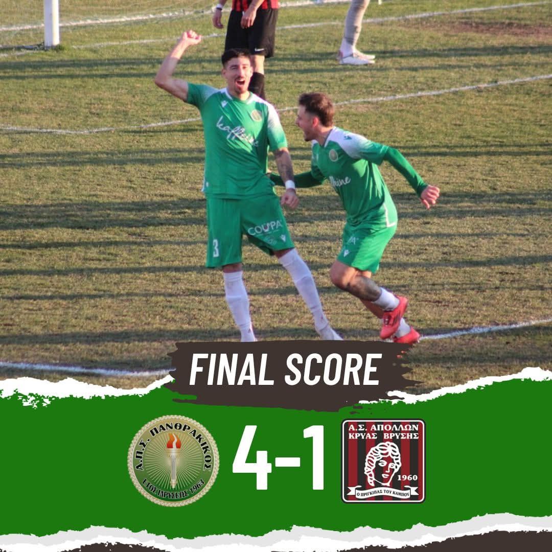 Πραγματοποιώντας μια ακόμη εντυπωσιακή εμφάνιση ο Πανθρακικός συνέχισε το σερί των νικών του στο πρωτάθλημα της Γ Εθνικής επικρατώντας,στο ΔΑΚ του Απόλλωνος Κρύας Βρύσης 4-1 (18′ Παχούμης, 21′ Καραγιάννης, 53′ Λαρέα, 74′ Καψάσκης – 55′ Ταουσιάνης). Έτσι μπήκε με το δεξί η ομάδα της Κομοτηνής στο 2025 ατενίζοντας το μέλλον με αισιοδοξία παρά την γνωστή περιπέτεια με την τιμωρία του.