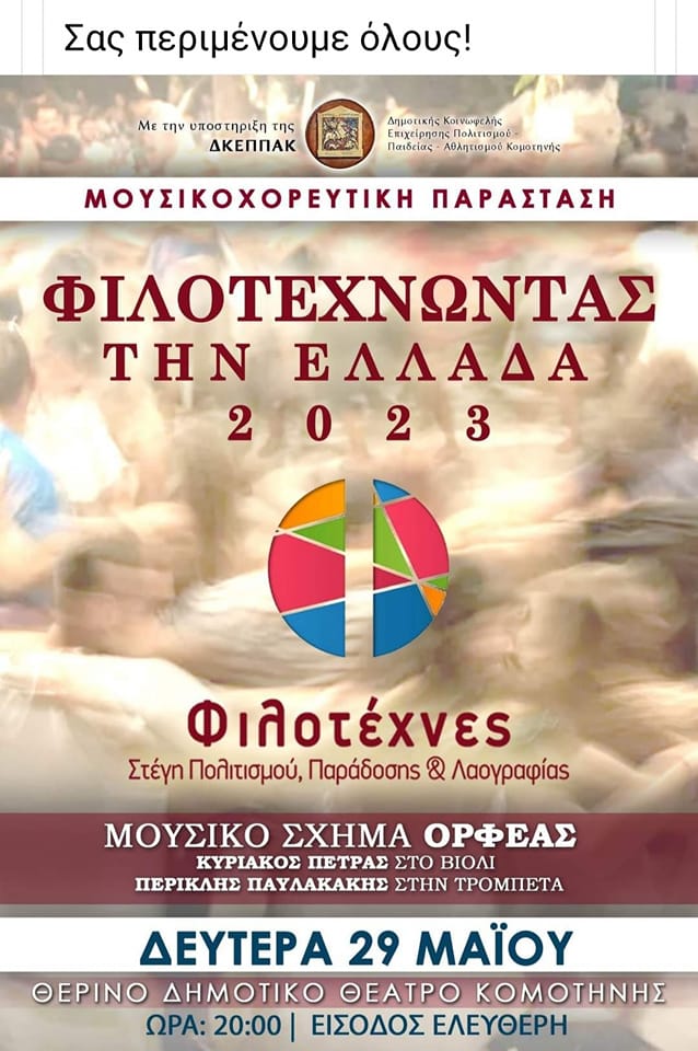 Η Στέγη Πολιτισμού Παράδοσης και Λαογραφίας Κομοτηνής Φιλοτέχνες διοργανώνουν για μία ακόμη χρονιά την μουσικοχορευτική παράσταση “Φιλοτεχνώντας την Ελλάδα 2023” που θα γίνει στο Θερινό Δημοτικό Θέατρο Κομοτηνής, την Δευτέρα 29 Μαΐου στις 20:00.