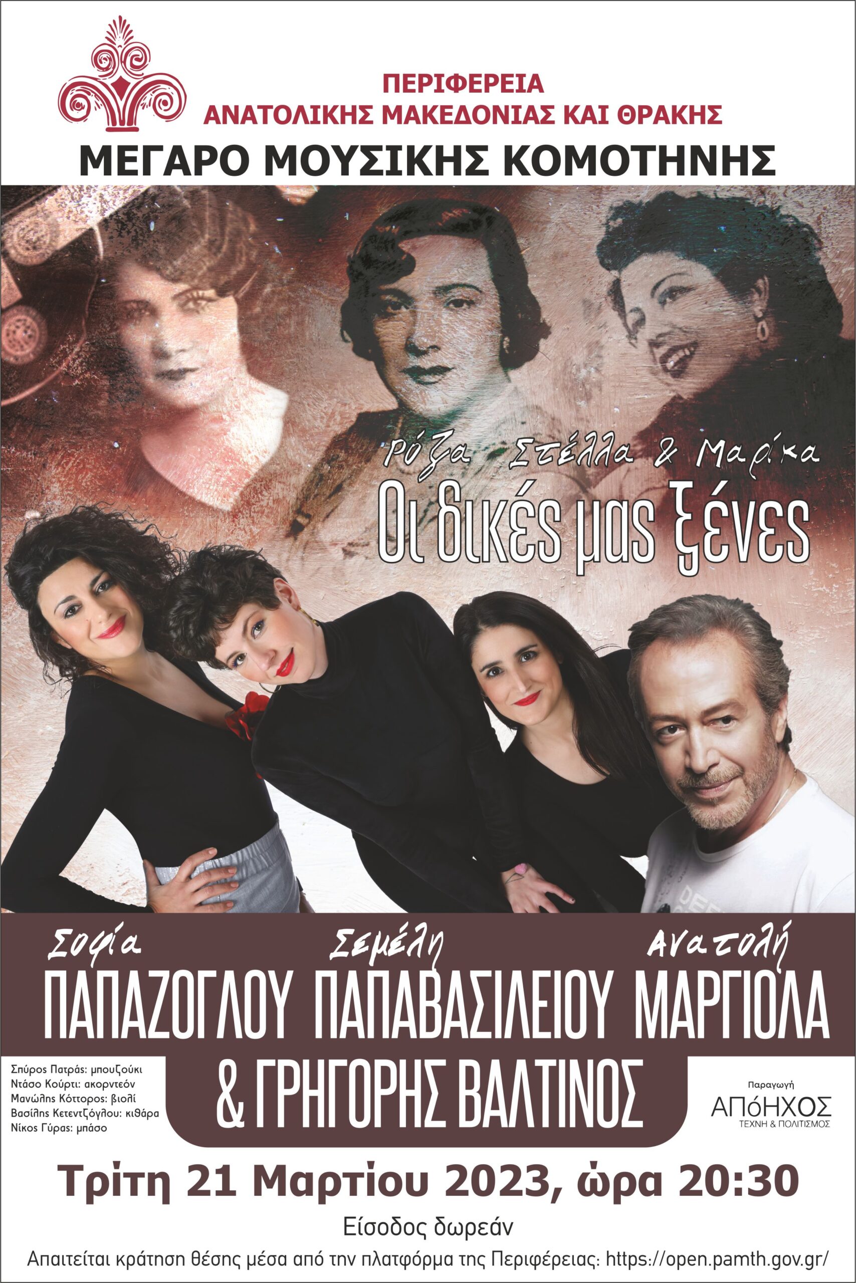 Η Περιφέρεια Ανατολικής Μακεδονίας και Θράκης παρουσιάζει στο Μέγαρο Μουσικής Κομοτηνής το την εξαιρετική μουσική παράσταση «Ρόζα, Στέλλα και Μαρίκα: οι Δικές μας Ξένες», με το Γρηγόρη Βαλτινό στην αφήγηση, τη Σοφία Παπάζογλου, την Ανατολή Μαργιόλα και τη Σεμέλη Παπαβασιλείου στο τραγούδι και με συνοδεία έξι κορυφαίων μουσικών, την Τρίτη 21 Μαρτίου 2023 στις 8.30 το βράδυ. Η παράσταση είναι αφιερωμένη στις τρεις εμβληματικές τραγουδίστριες Ρόζα Εσκενάζυ, Στέλλα Χασκίλ και Μαρίκα Νίνου, και οι τρεις προσφυγοπούλες, οι δύο πρώτες εβραϊκής καταγωγής και η τελευταία αρμένικης.