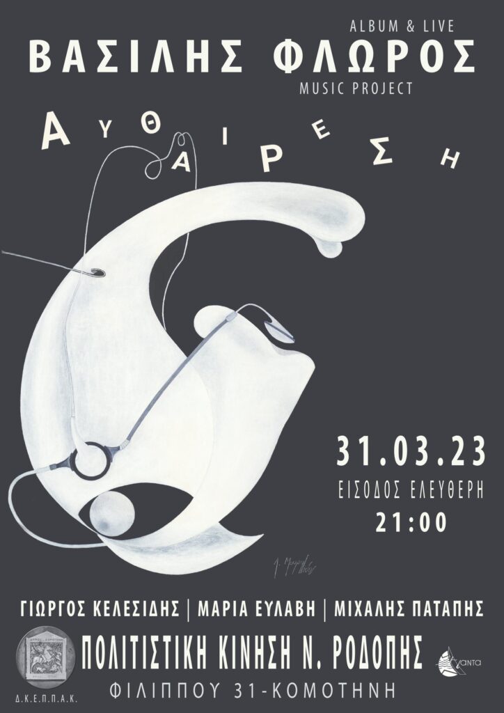 Η Δημοτική Κοινωφελής Επιχείρηση Αθλητισμού, Παιδείας και Πολιτισμού Δήμου Κομοτηνής και η Aganda Music Productions σας προσκαλούν στην παρουσίαση της νέας δισκογραφικής πρότασης του Βασίλη Φλώρου με τον τίτλο  Α Υ Θ Α Ι Ρ Ε Σ Η, την Παρασκευή 31 Μαρτίου 2023 στις 21:00 στον Χώρο Πολιτισμού της Πολιτιστικής Κίνησης Ν. Ροδόπης