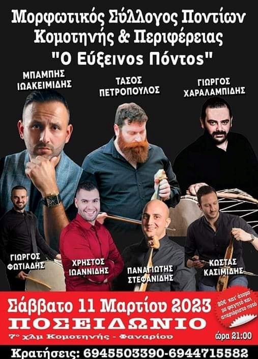Ο Μορφωτικός Σύλλογος Ποντίων Κομοτηνής και Περιφέρειας «Ο Εύξεινος Πόντος», σας προσκαλεί στον ετήσιο χορό που διοργανώνει, το Σάββατο 11 Μαρτίου 2023 και ώρα 21:00, στο κοσμικό κέντρο «Ποσειδώνιο» (5ο χμ Κομοτηνής-Φαναρίου). Στο καλλιτεχνικό πρόγραμμα ο Μπάμπης Ιωακειμίδης και ο Χρήστος Ιωαννίδης στο τραγούδι, ο Τάσος Πετρόπουλος στην λύρα και το τραγούδι, ο Παναγιώτης Στεφανίδης στην λύρα, ο Κώστας Κασιμίδης στο αγγείο, ο Γιώργος Χαραλαμπίδης και ο Γιώργος Φωτιάδης στο νταούλι. Την βραδιά θα πλαισιώσουν κάποιες από τις χορευτικές ομάδες του Σωματείου και θα τιμηθούν οι αριστούχοι μαθητές και οι επιτυχόντες στην τριτοβάθμια εκπαίδευση.