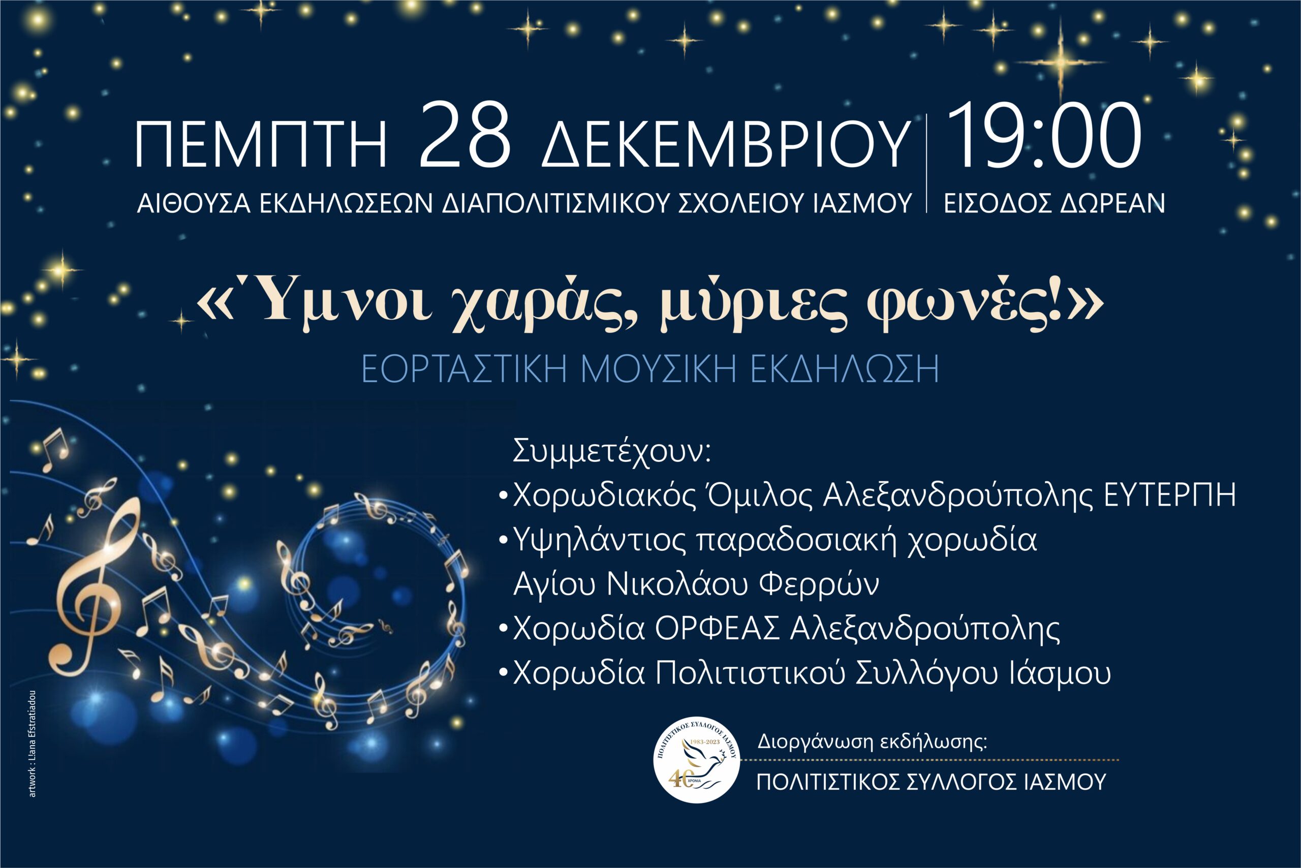 Η εκδήλωση ” Ύμνοι χαράς, μύριες φωνές ” αρχίζει στις 19:00 και μετά το πέρας της ακολουθεί κέρασμα με Ιασμιώτικα εδέσματα.