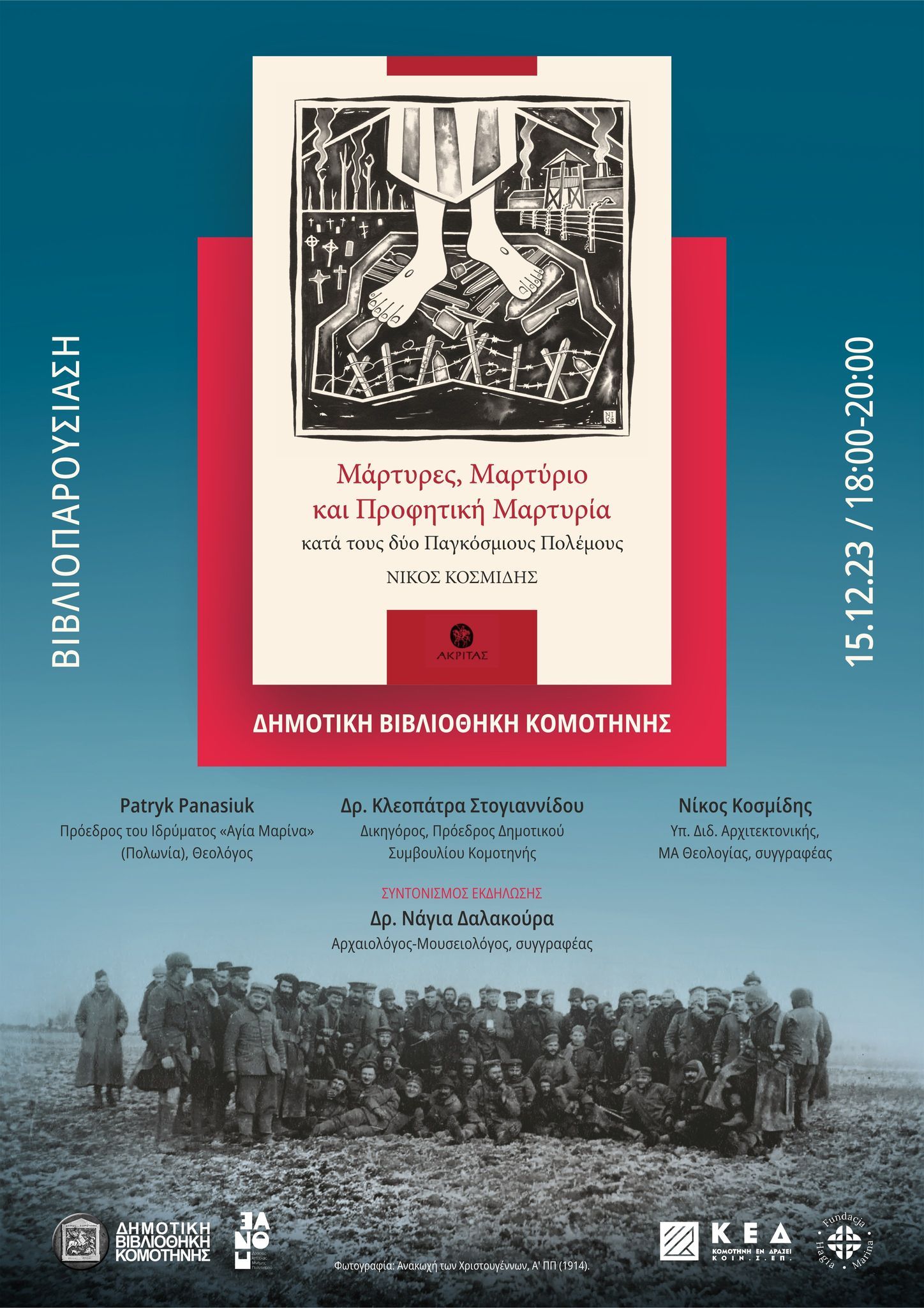 Η Δημοτική Βιβλιοθήκη Κομοτηνής στο πλαίσιο των δράσεων που υλοποιούνται με την ΚΟΙΝΣΕΠ «Κομοτηνή Εν Δράσει» και το πρόγραμμα Δράσεις Ιστορίας Μνήμης Πολιτισμού, διοργανώνουν την Παρασκευή 15 Δεκεμβρίου, στις 18:00-20:00, την παρουσίαση του βιβλίου «Μάρτυρες, Μαρτύριο και Προφητική Μαρτυρία» (Εκδόσεις Ακρίτας, 2023), του Νίκου Κοσμίδη.